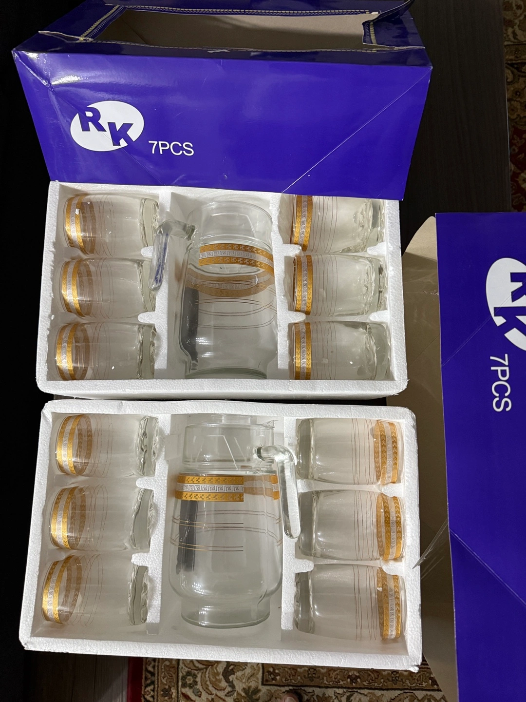 New in box, 7-piece glass beverage set. Includes one glass pitcher and six tumblers. Gold detailing on each piece. Elegant design, perfect for entertaining. Each box sold Separately