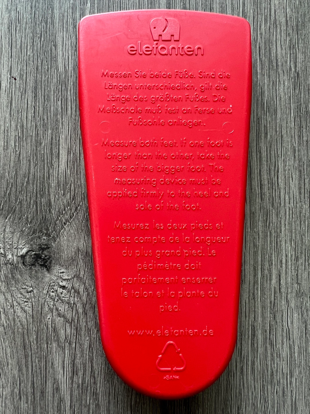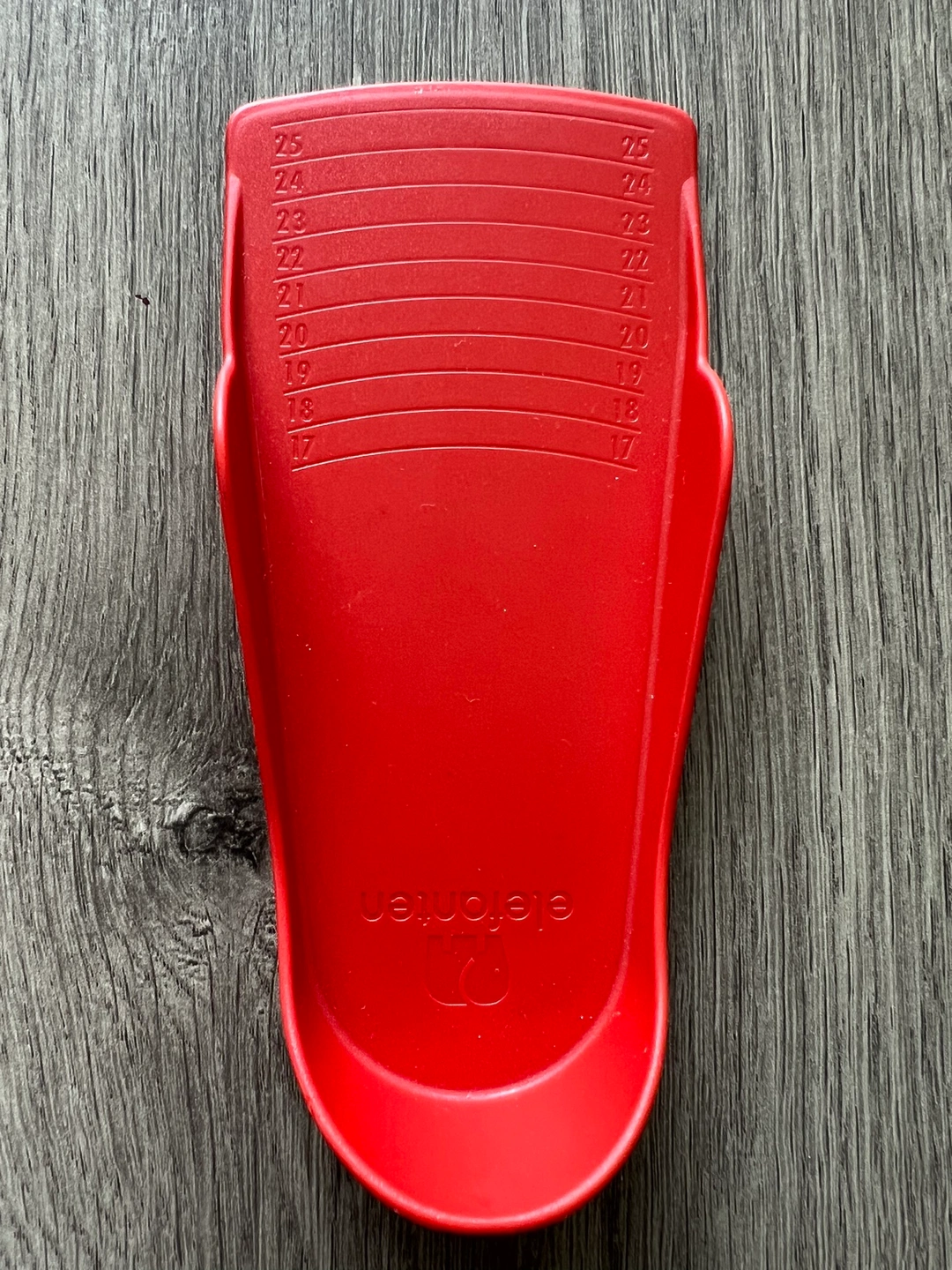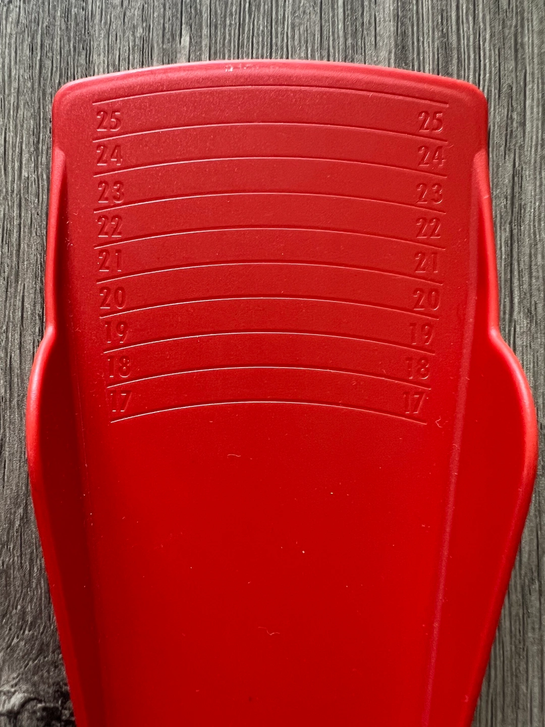 Red foot measuring device that can be used to measure shoe sizes. The device has markings from size 17 to size 25. Baby / Toddler sizes , The device is shaped like a foot and has an indentation for the heel. The top has a measurement scale on both sides.