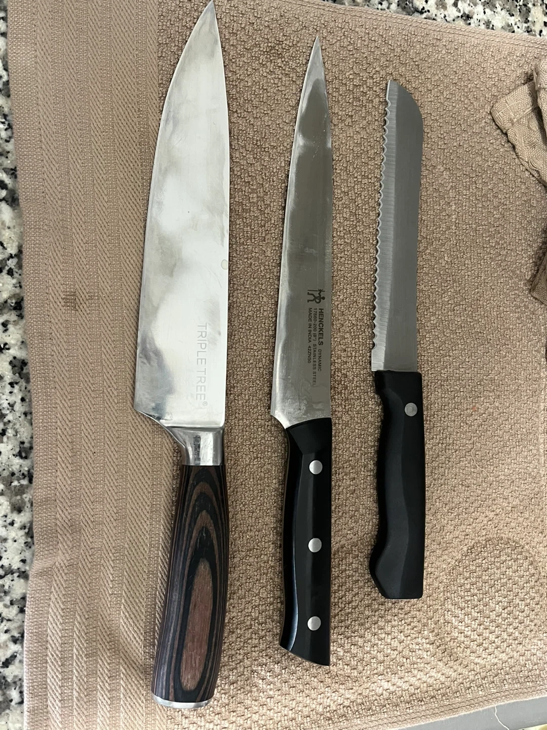 Includes a Triple Tree chef's knife and a Henckels bread knife and utility knife. Blades are stainless steel. Handles have a classic design.