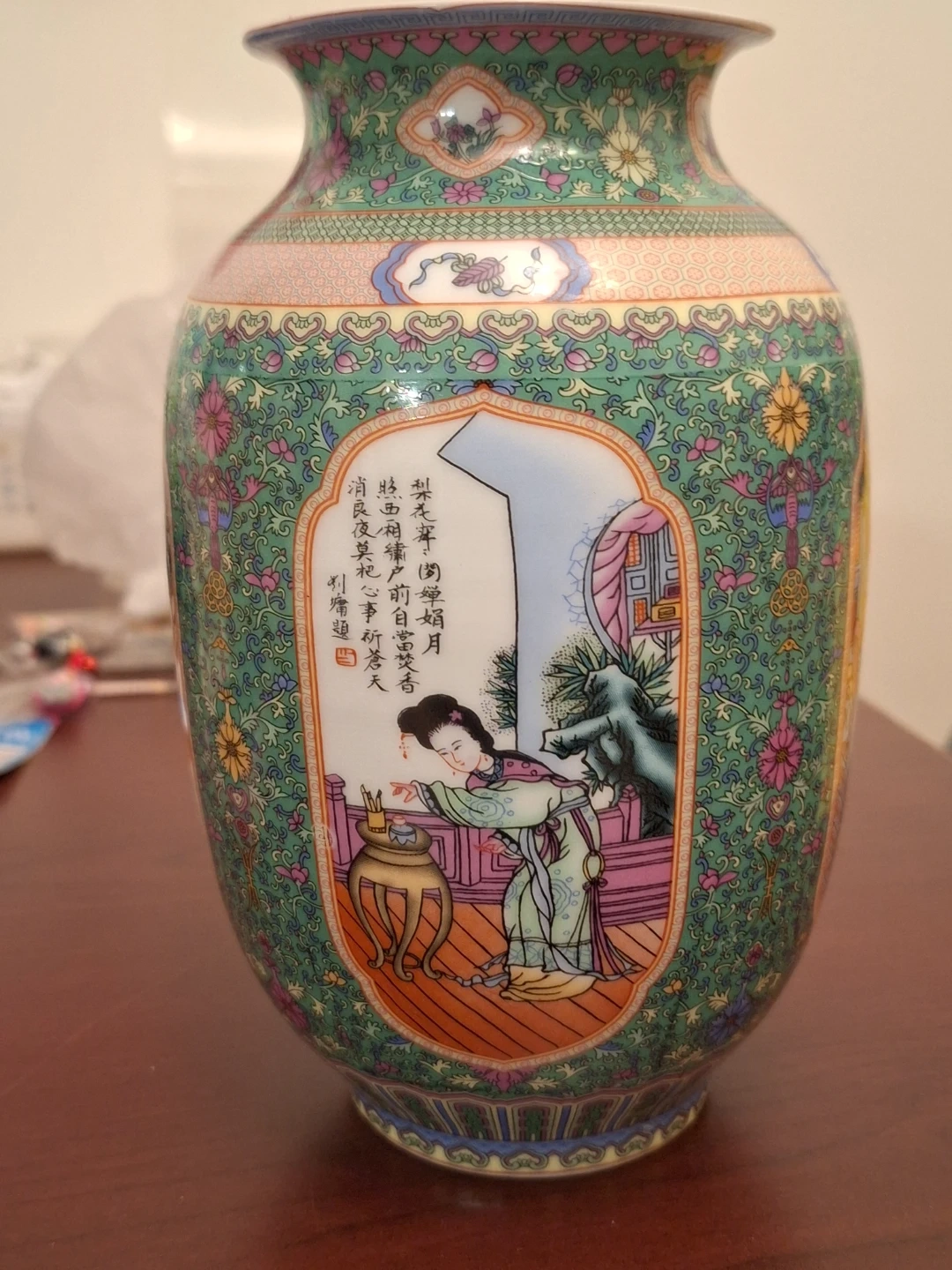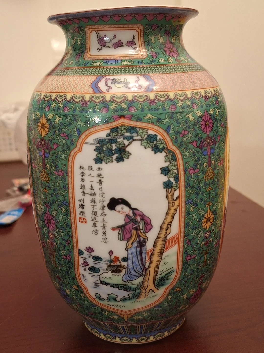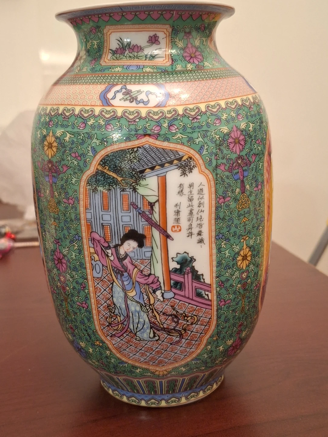 This is a beautiful ceramic vase adorned with intricate Asian-inspired artwork and calligraphy. It features a green background with floral patterns and detailed scenes of women in traditional settings. The vase has a classic shape and would make a lovely decorative piece.