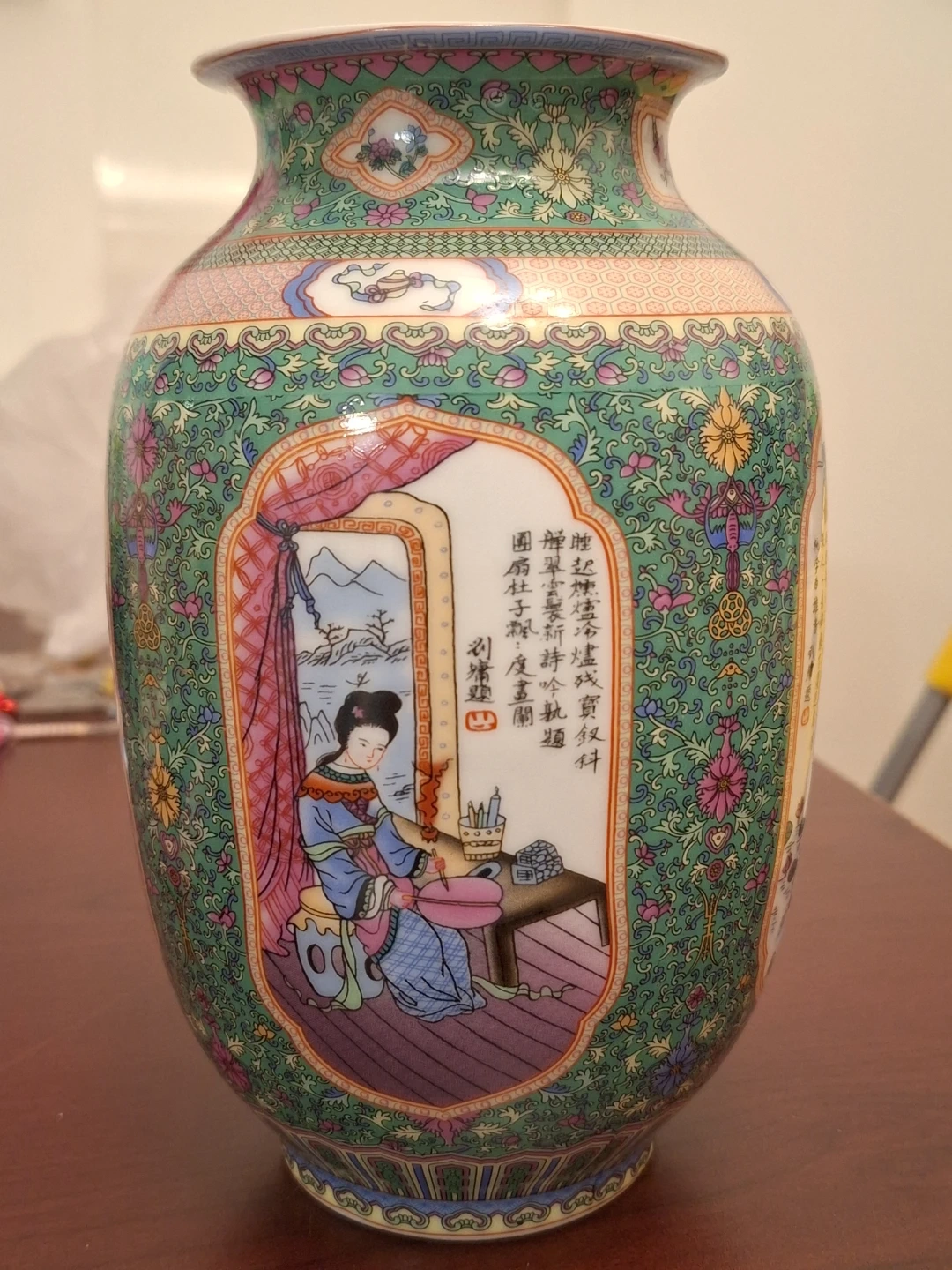 This is a beautiful ceramic vase adorned with intricate Asian-inspired artwork and calligraphy. It features a green background with floral patterns and detailed scenes of women in traditional settings. The vase has a classic shape and would make a lovely decorative piece.