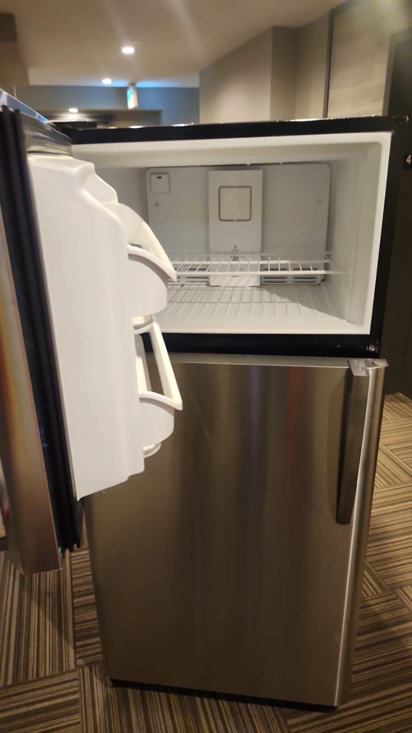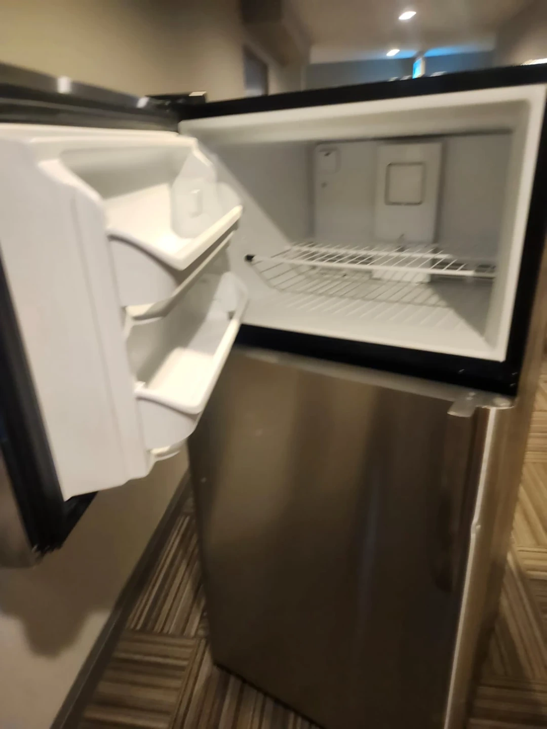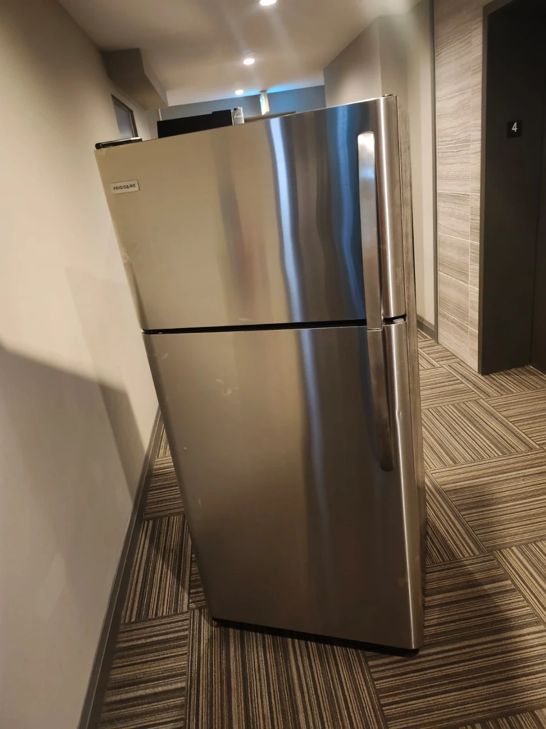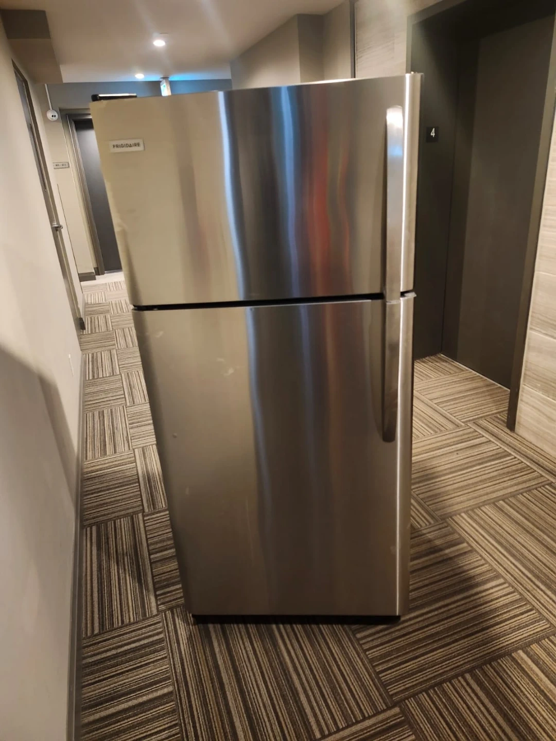 This Frigidaire refrigerator comes in a sleek stainless steel finish. It's a top-freezer model with adjustable shelves inside. Perfect for a small apartment or dorm room!
