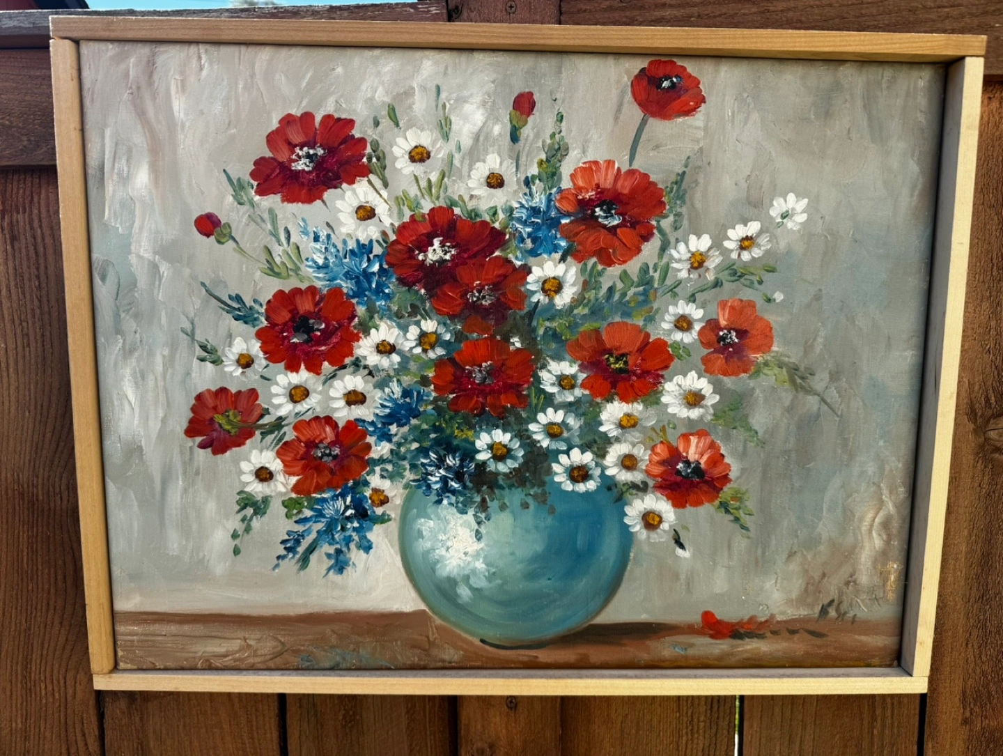A beautiful floral oil painting. Features a bouquet of vibrant red poppies and white flowers, set in a blue vase. The painting has a natural wood frame. Displaying this painting could make any room feel more peaceful. artist, J. Valentine. Feel free to reframe, once yours. OBO.