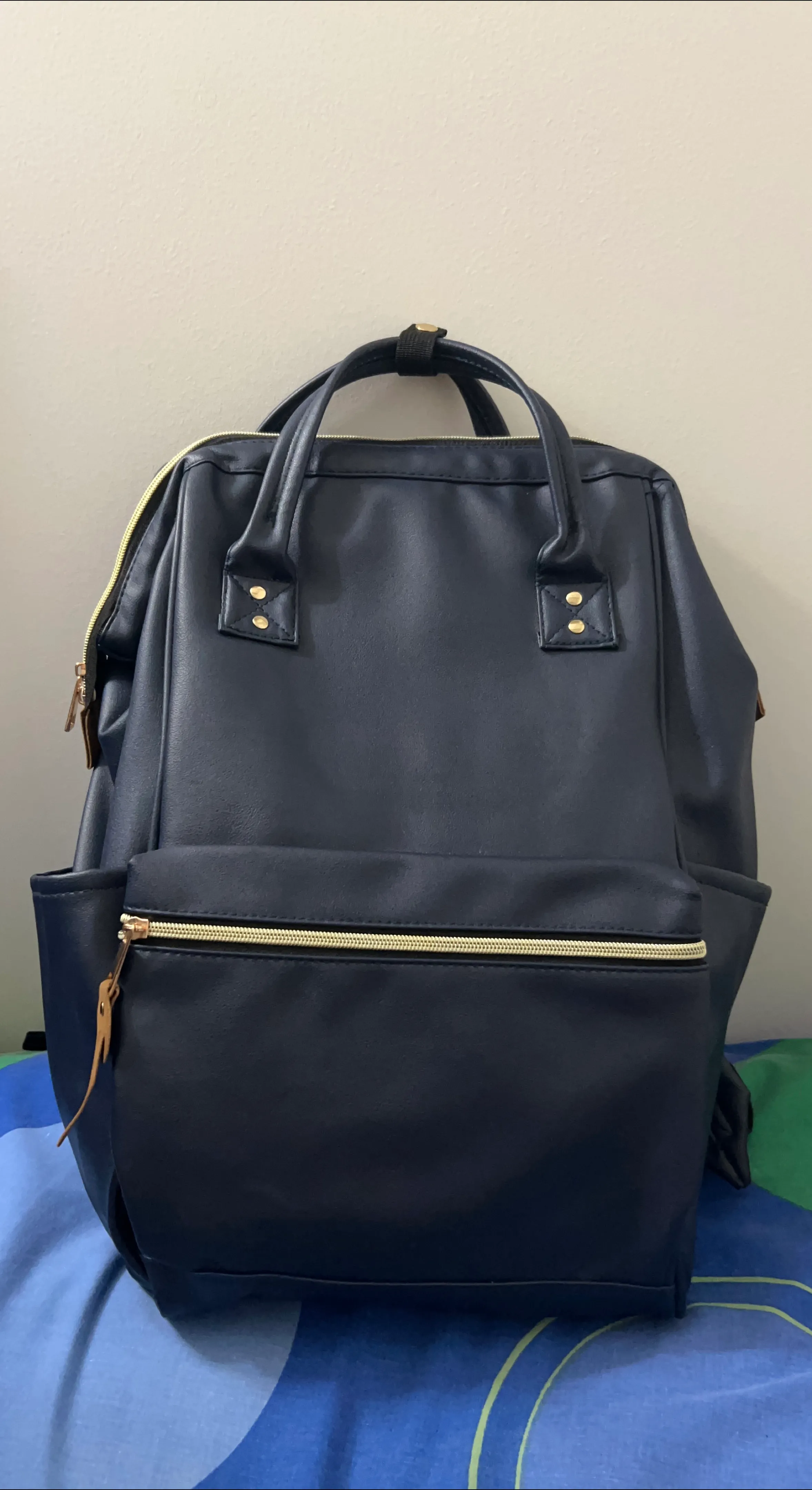 A navy blue backpack made from faux leather. It features a large front zipper pocket and side pockets. This bag is perfect for everyday use or travel.