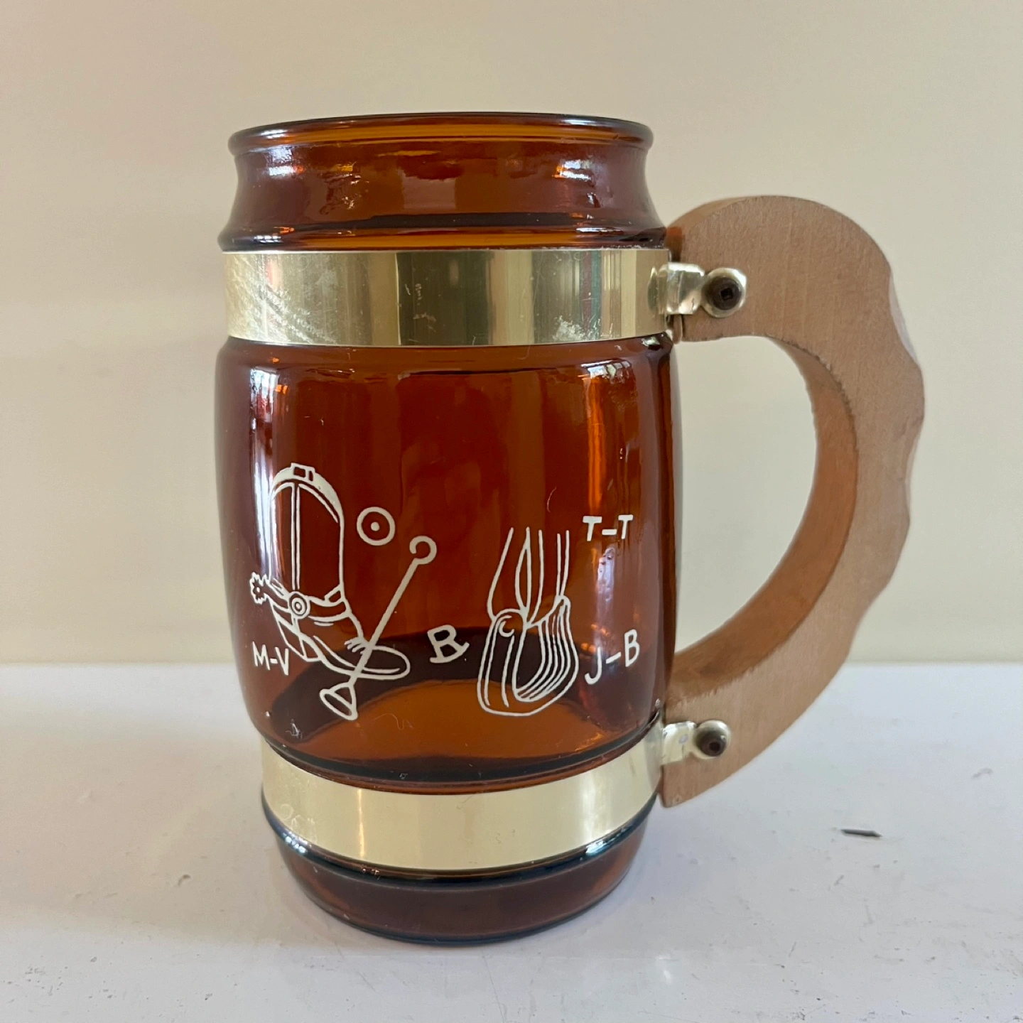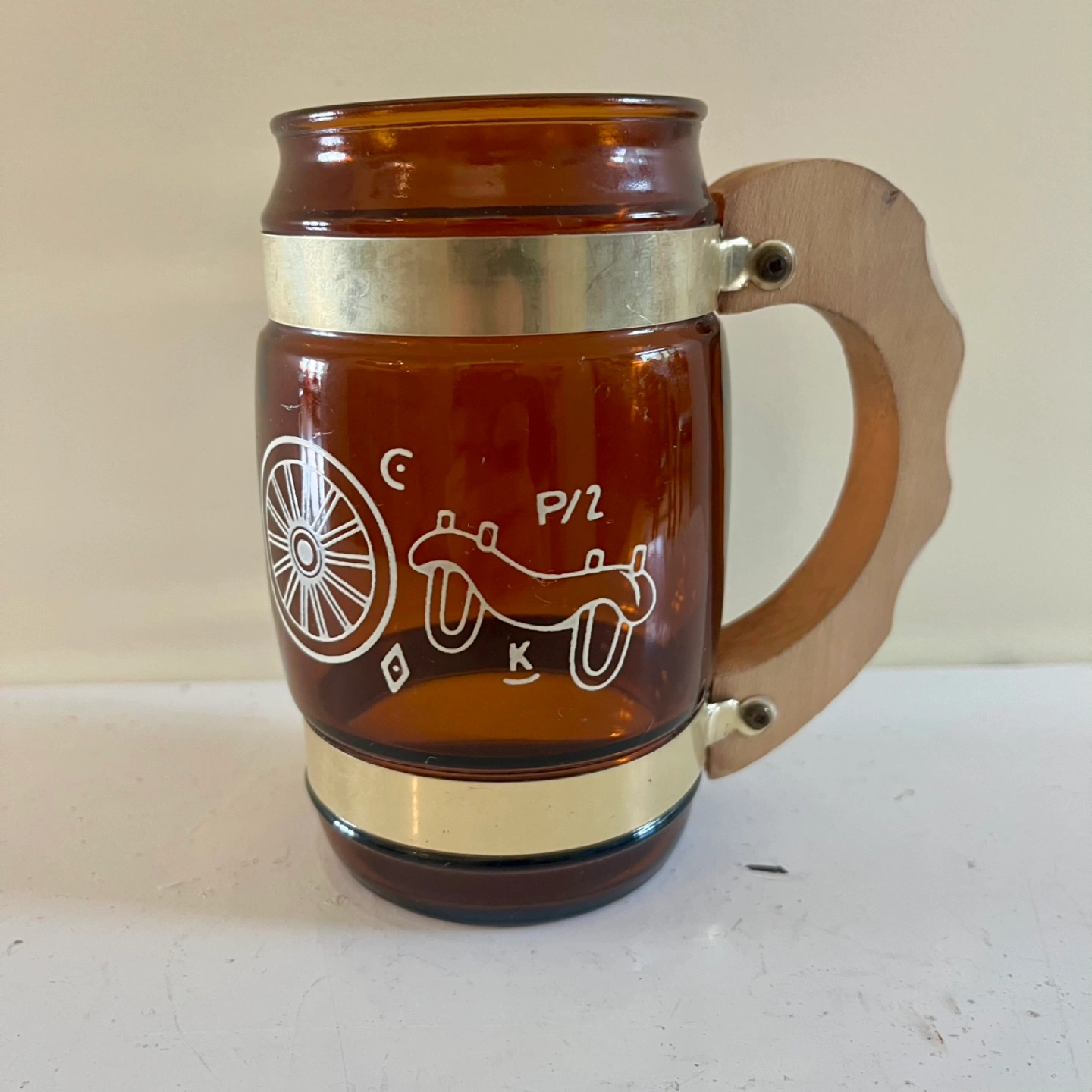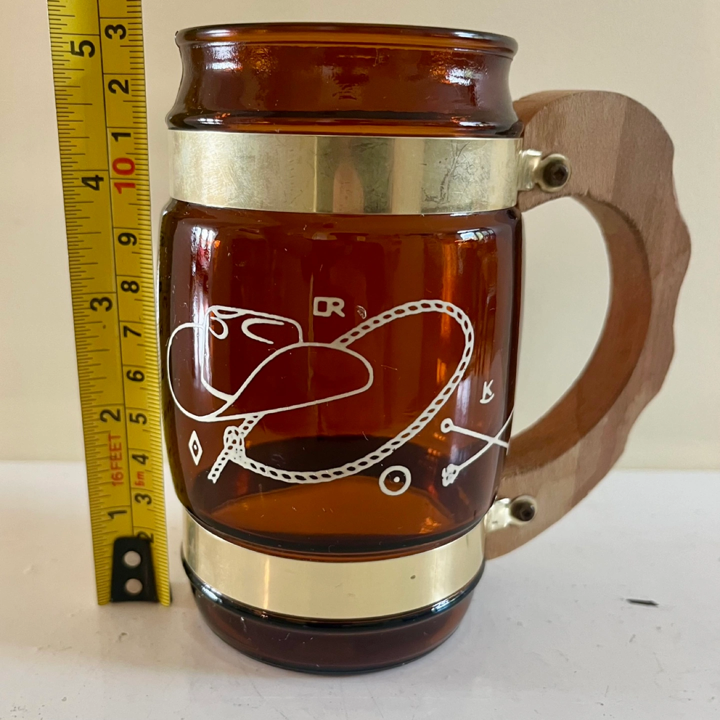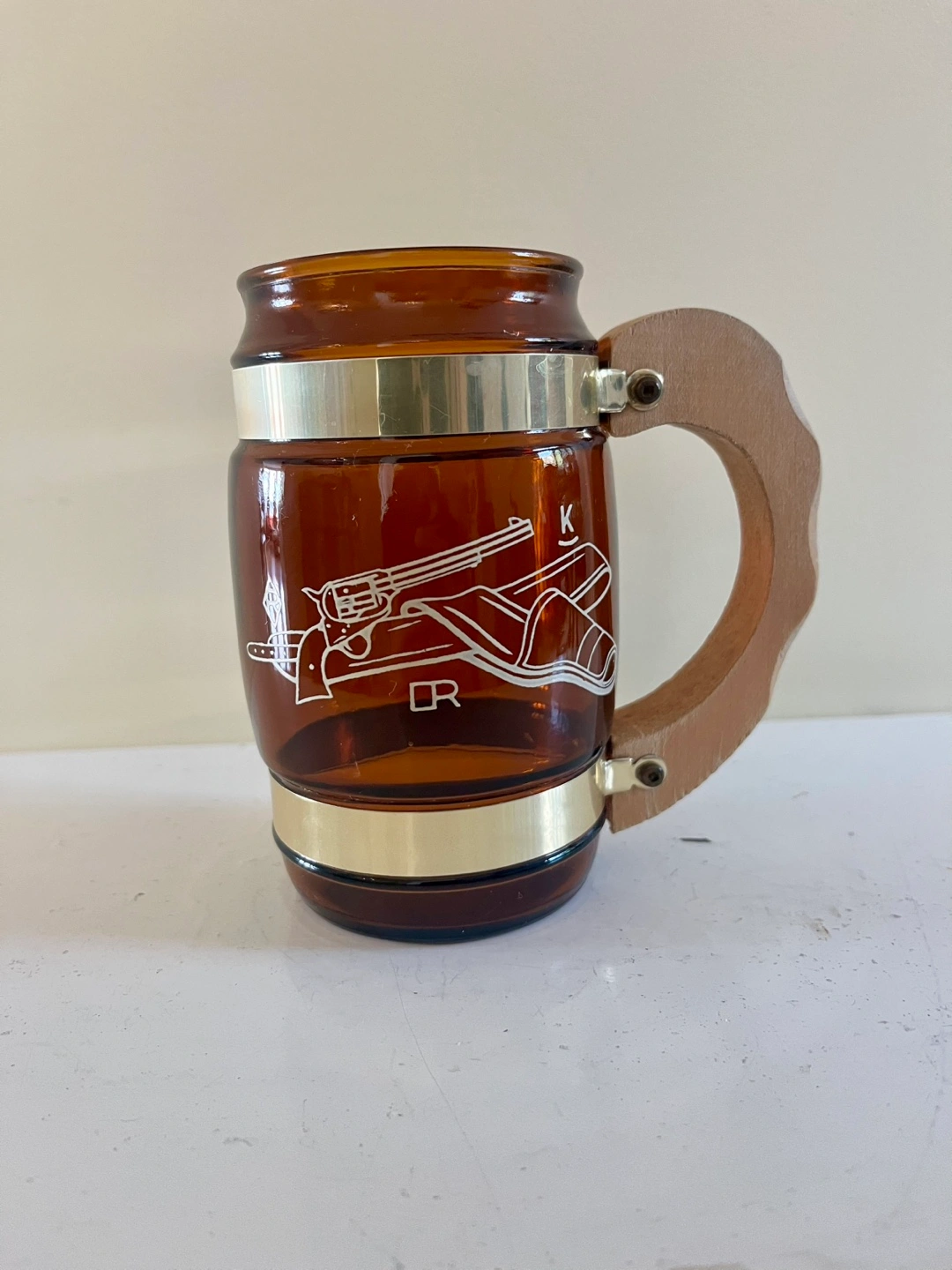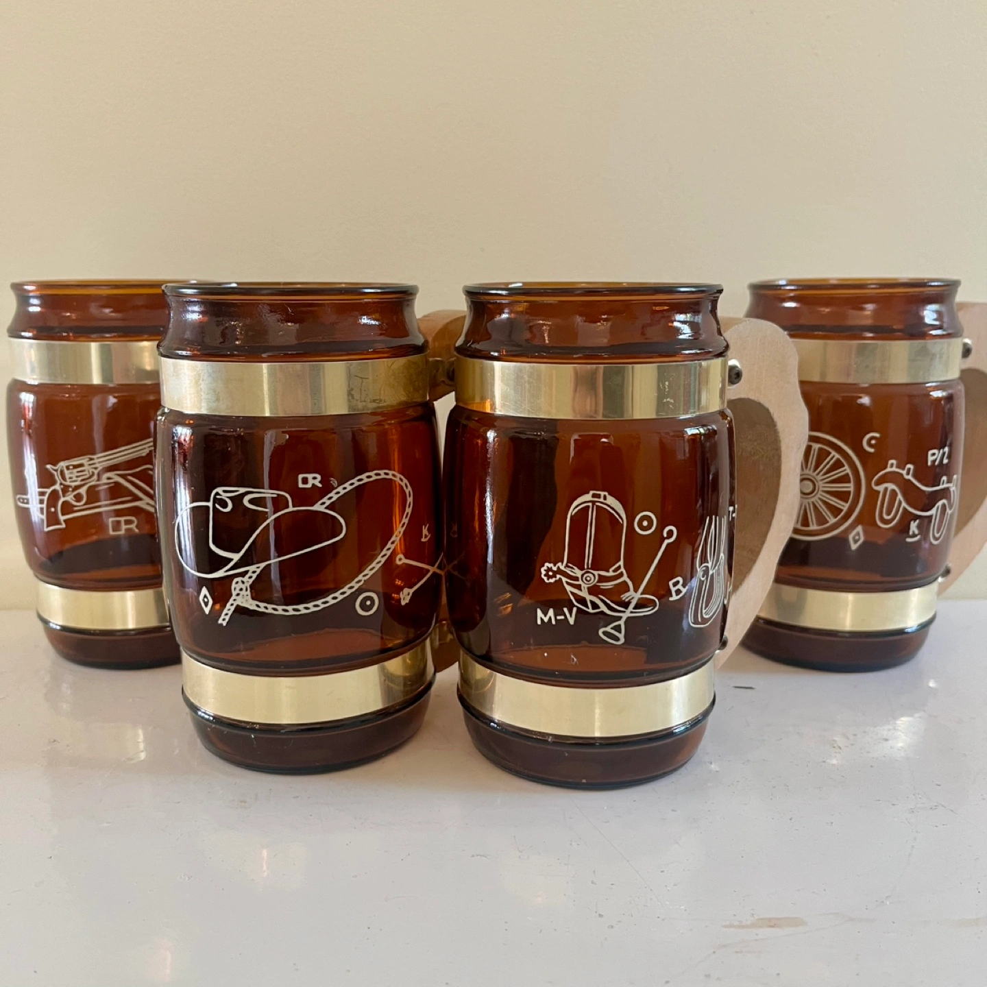 Four vintage Siesta Ware western cowboy barrel-shaped amber mugs. These retro beauties feature Etched western-themed graphics, brass-coloured bands and wooden handles.