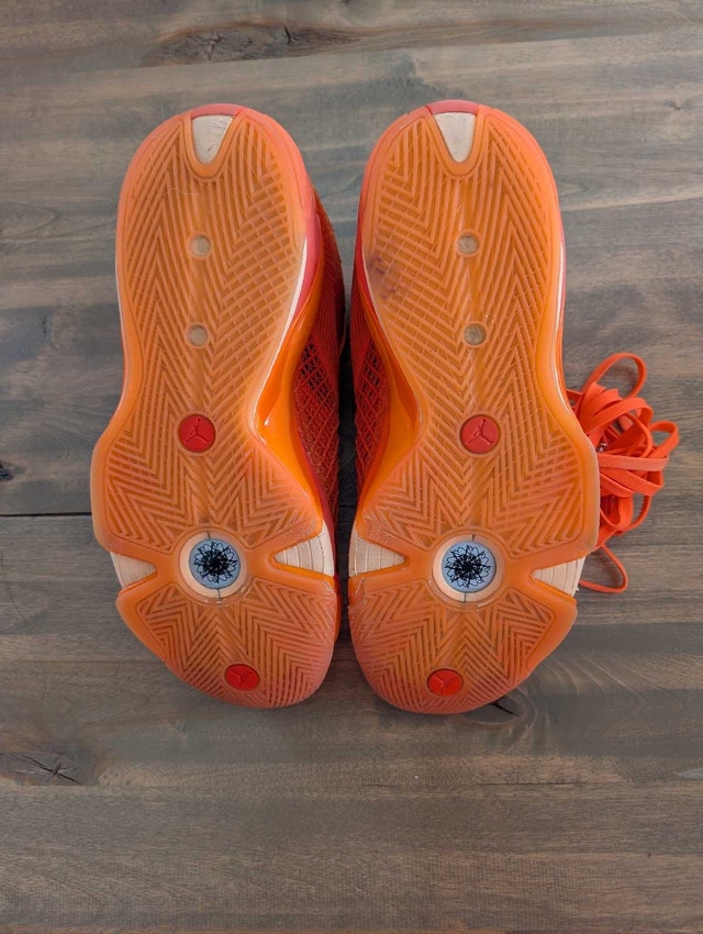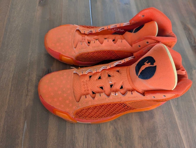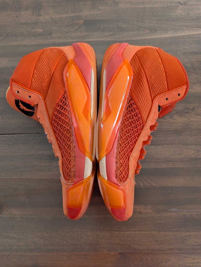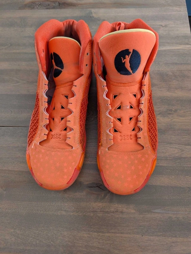 Step up your game with these Air Jordan XXXVIII (38) mid-top basketball shoes. They feature a vibrant orange colorway with a stars theme, premium leather uppers for durability and comfort, and a supportive midsole with a durable outsole for optimal traction. These shoes are used but have been professionally cleaned. See images for condition. Size is 13.5 US Women / 12 US Men (11 UK, 46 EU). Crafted in Vietnam.