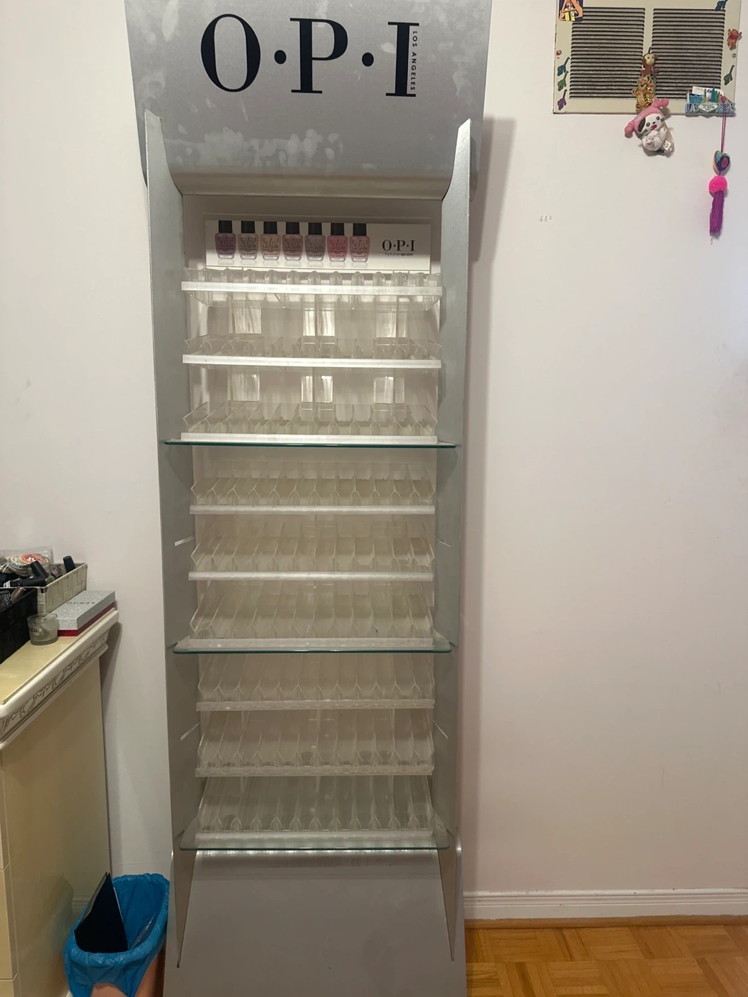 This OPI display stand is designed for nail polish bottles. It has multiple shelves with individual slots for organization. It's made of durable metal and plastic.