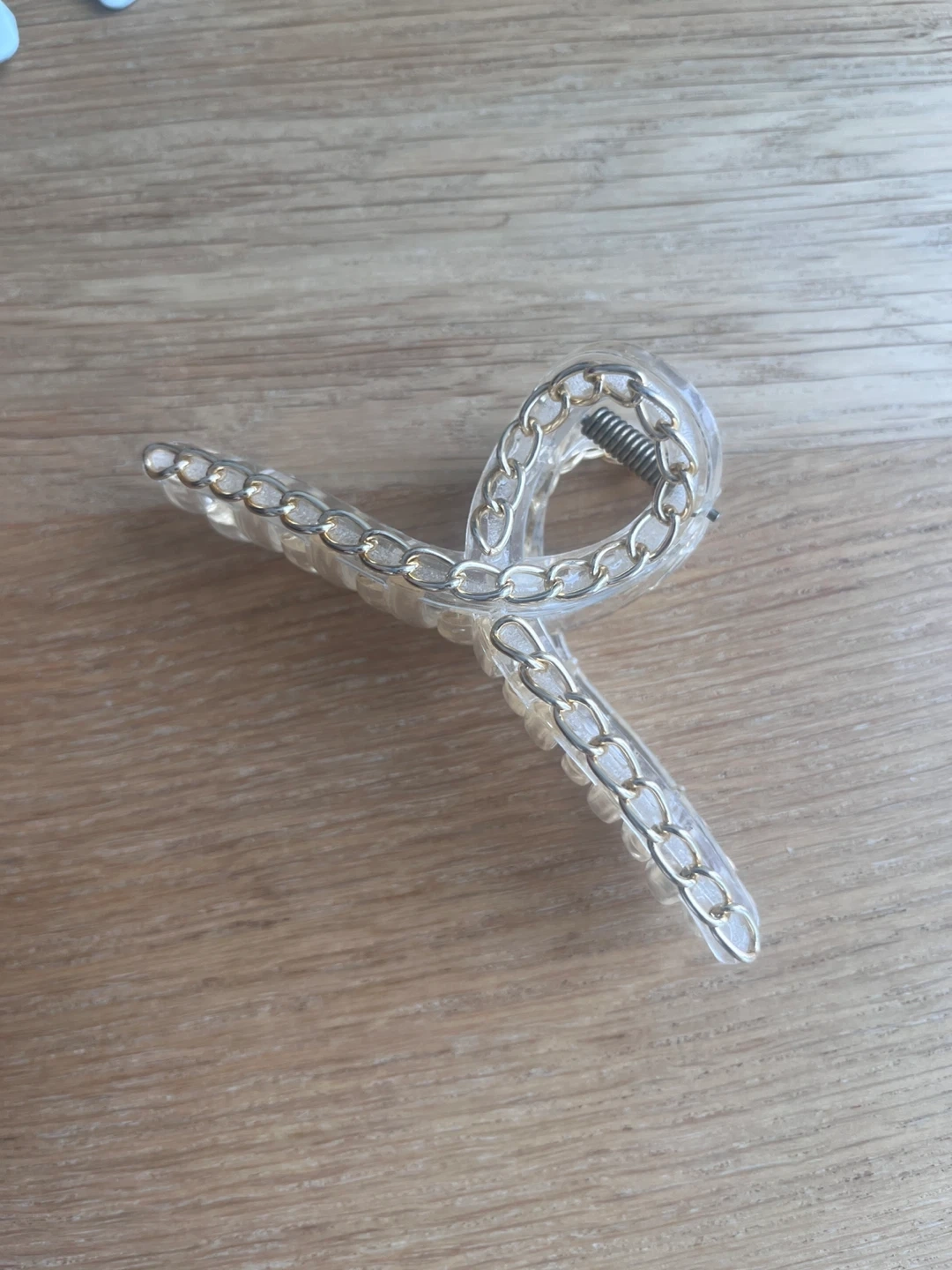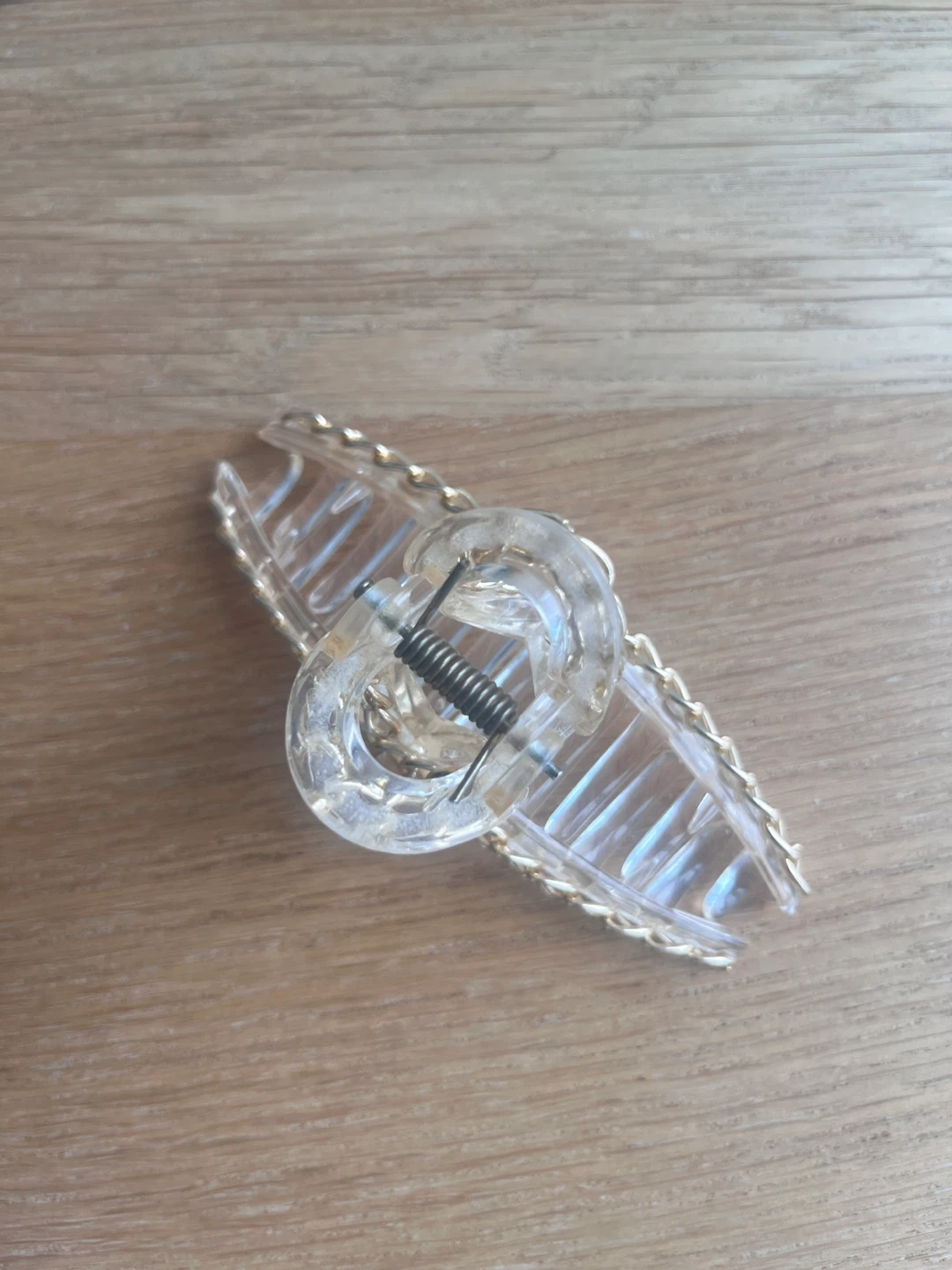 This clear claw clip features a decorative gold chain accent along the sides. It's designed with a strong spring for secure hold. This clip is great for managing thicker hair or creating updos. (Click other listings- Moving country sale - every clothes and handbags under $10)