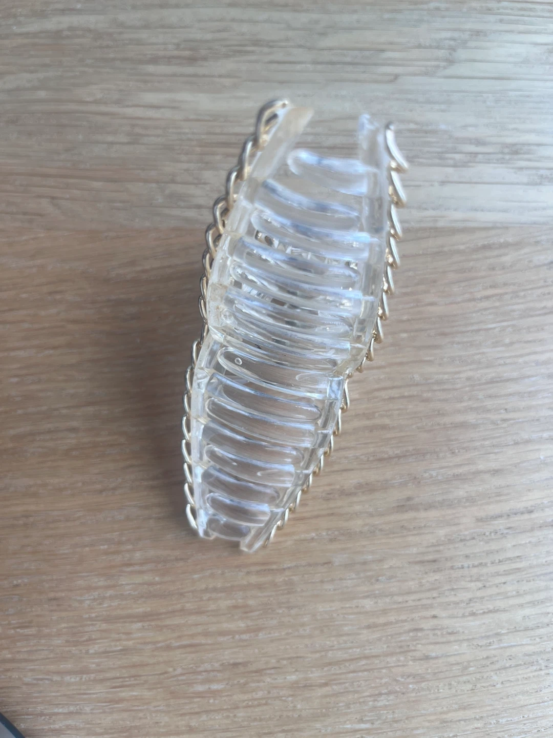 This clear claw clip features a decorative gold chain accent along the sides. It's designed with a strong spring for secure hold. This clip is great for managing thicker hair or creating updos. (Click other listings- Moving country sale - every clothes and handbags under $10)