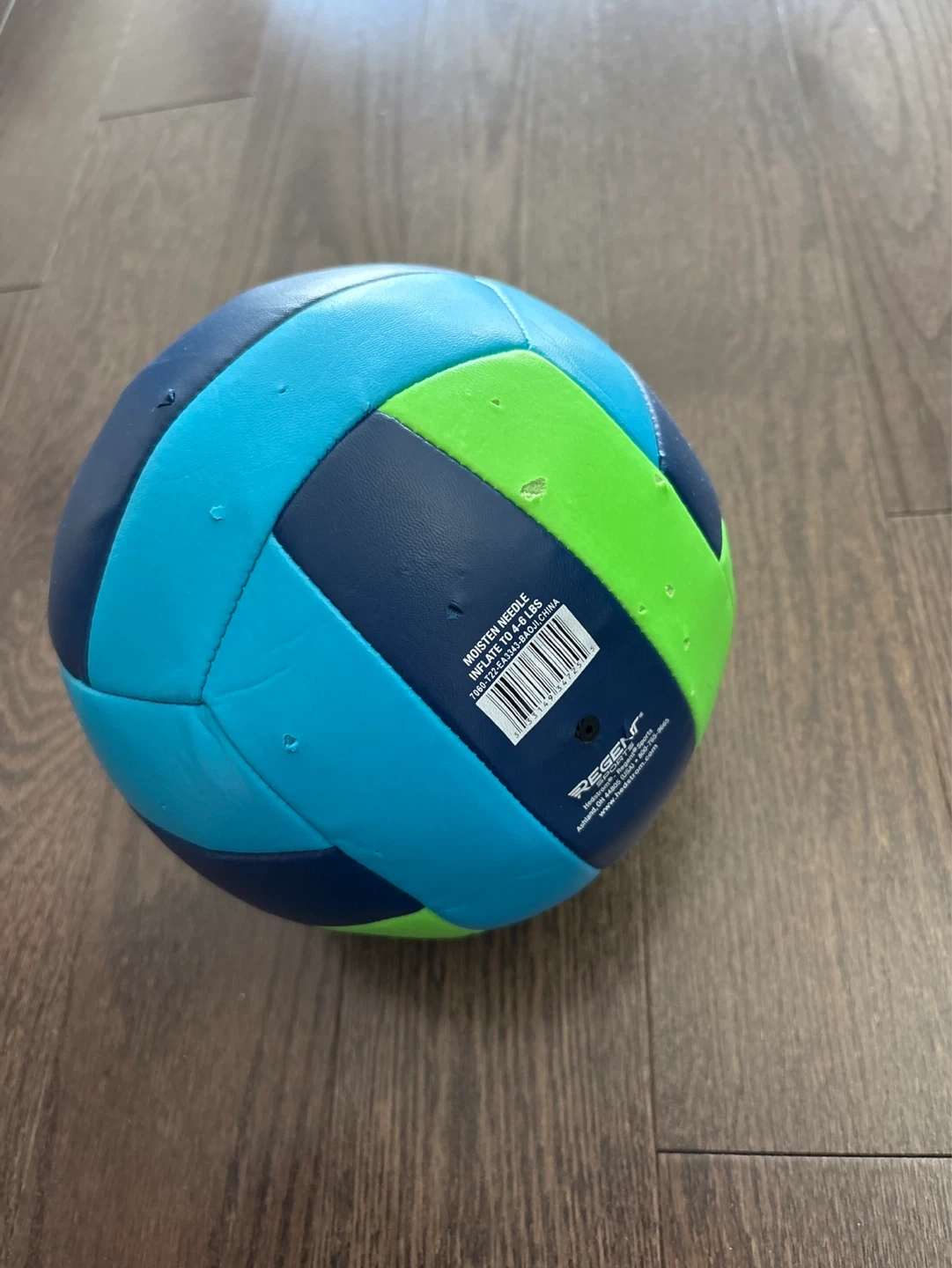 Official size volleyball by Regent Sports. Features a durable construction with a colourful blue, green, and light blue panel design. Suitable for recreational play.