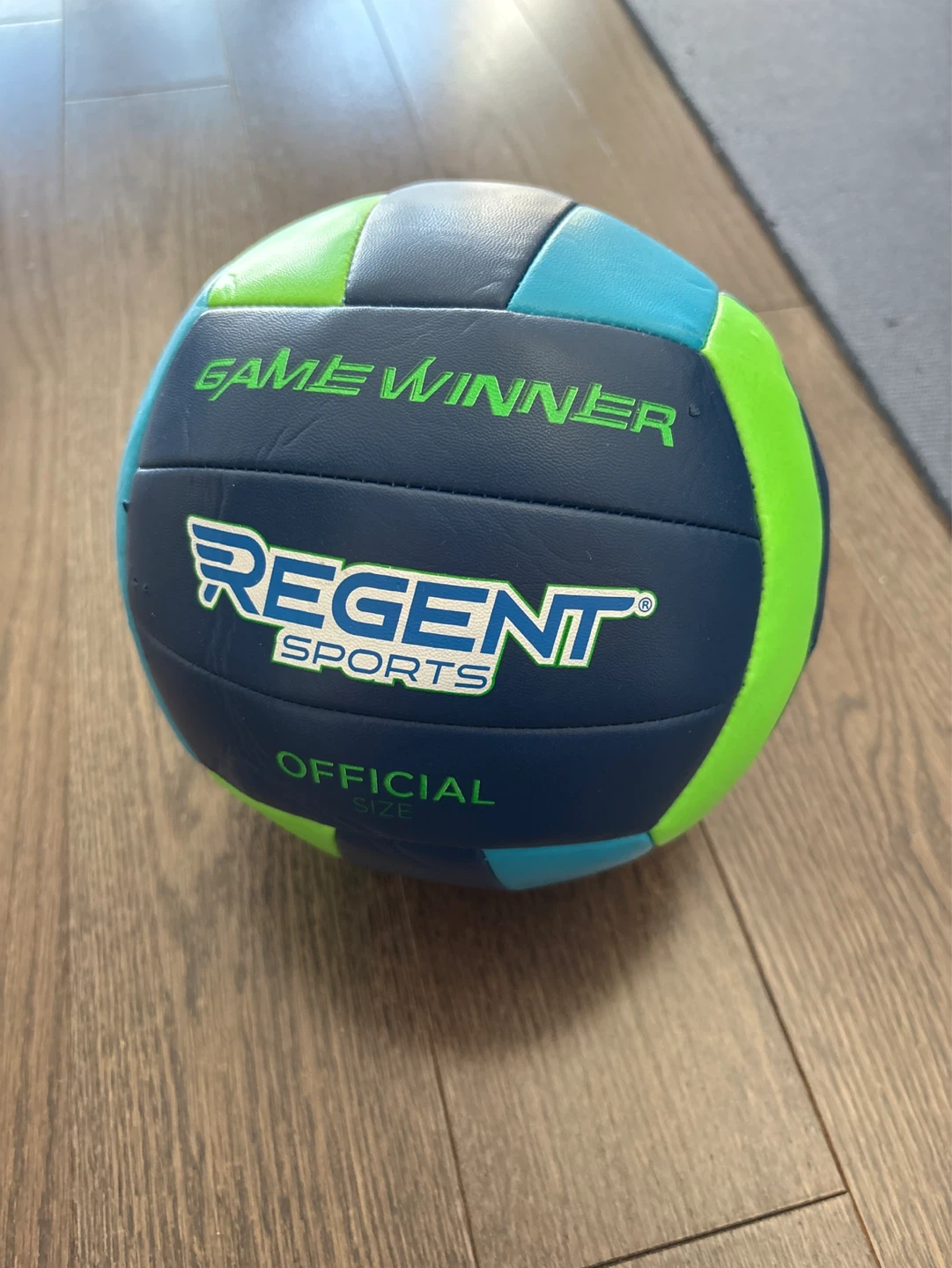 Official size volleyball by Regent Sports. Features a durable construction with a colourful blue, green, and light blue panel design. Suitable for recreational play.