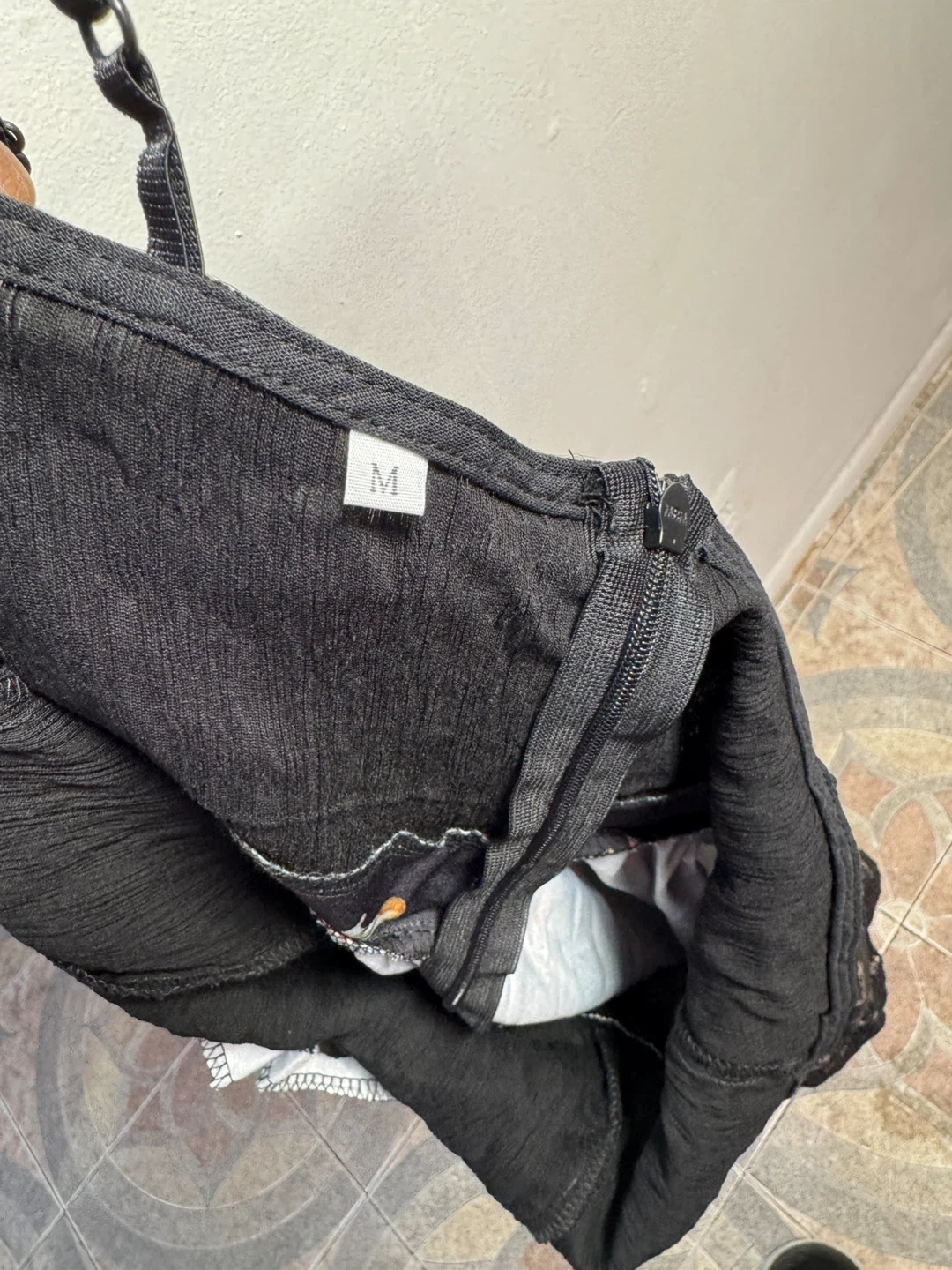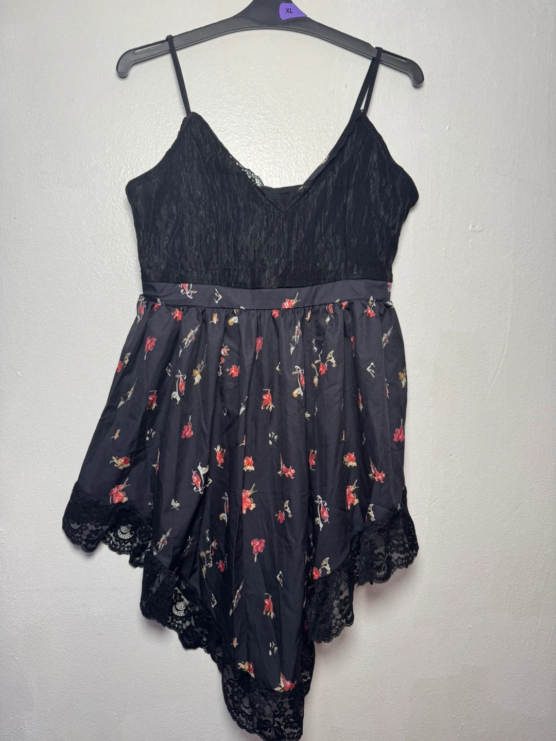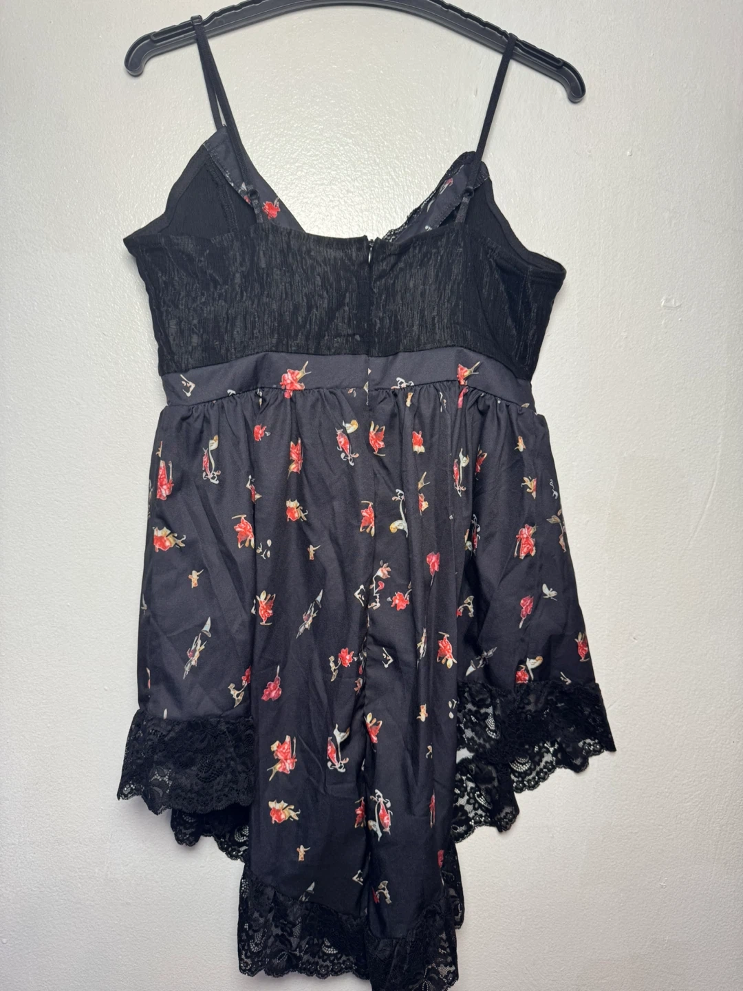 This black lingerie romper features a floral print and lace trim. It's a size medium. Perfect for adding a touch of flair!