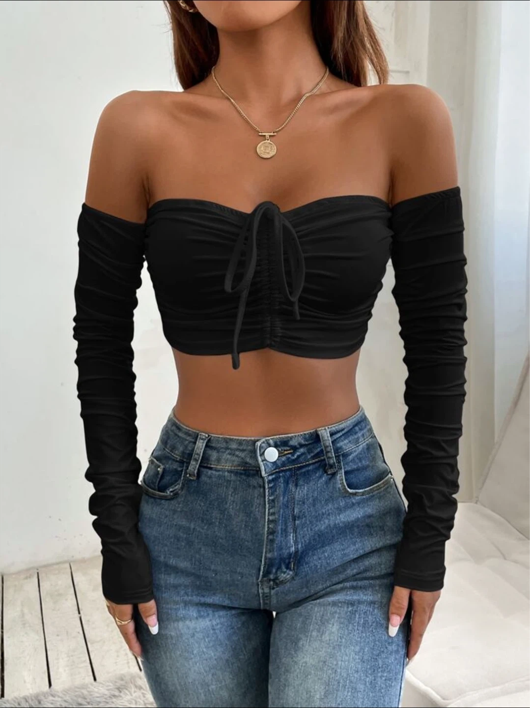This black crop top features an off-the-shoulder design with long, ruched sleeves and a drawstring tie at the front.
