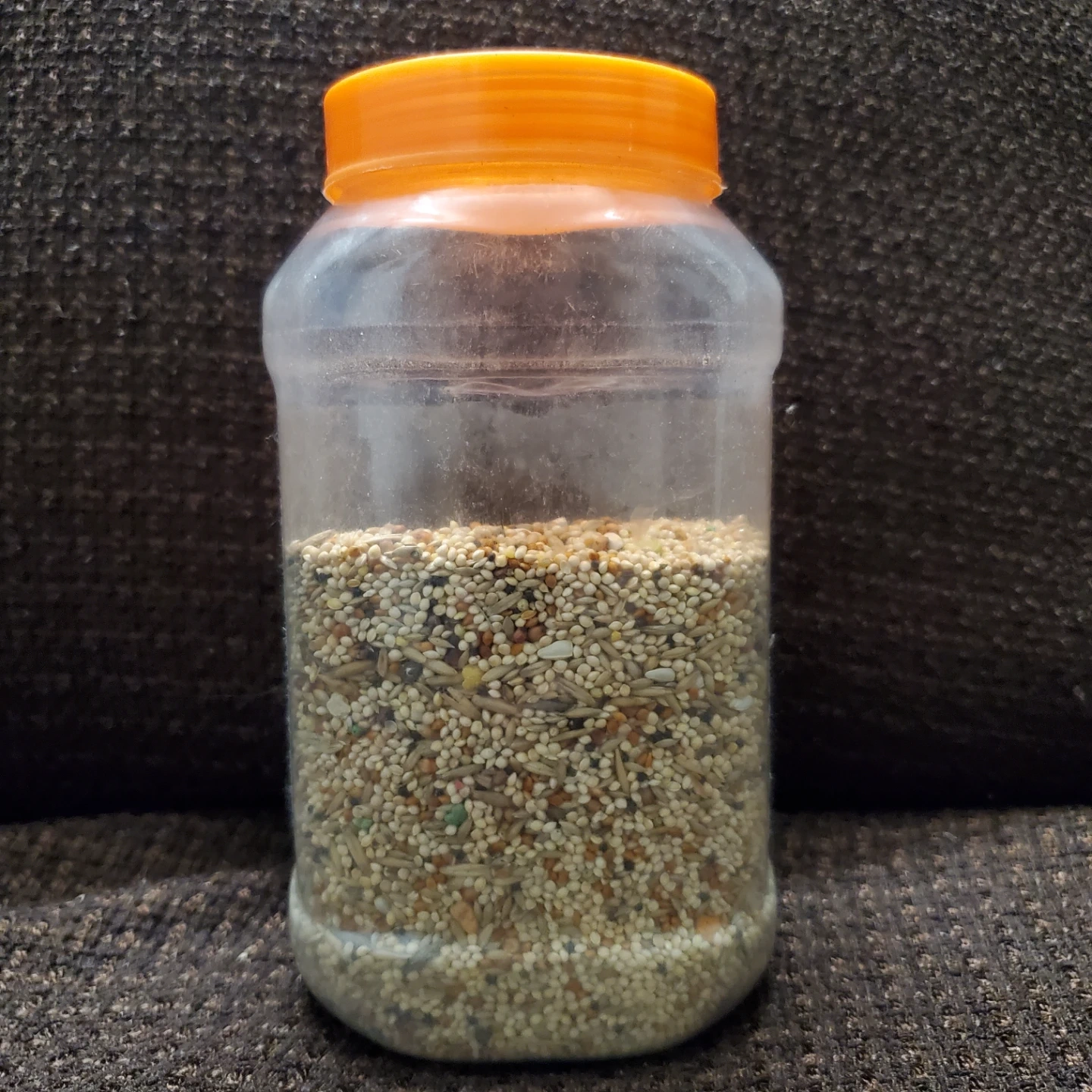This is a container of mixed bird seed. It's a blend of various grains and seeds. 3/4 full. Was for my budgie but she passed.