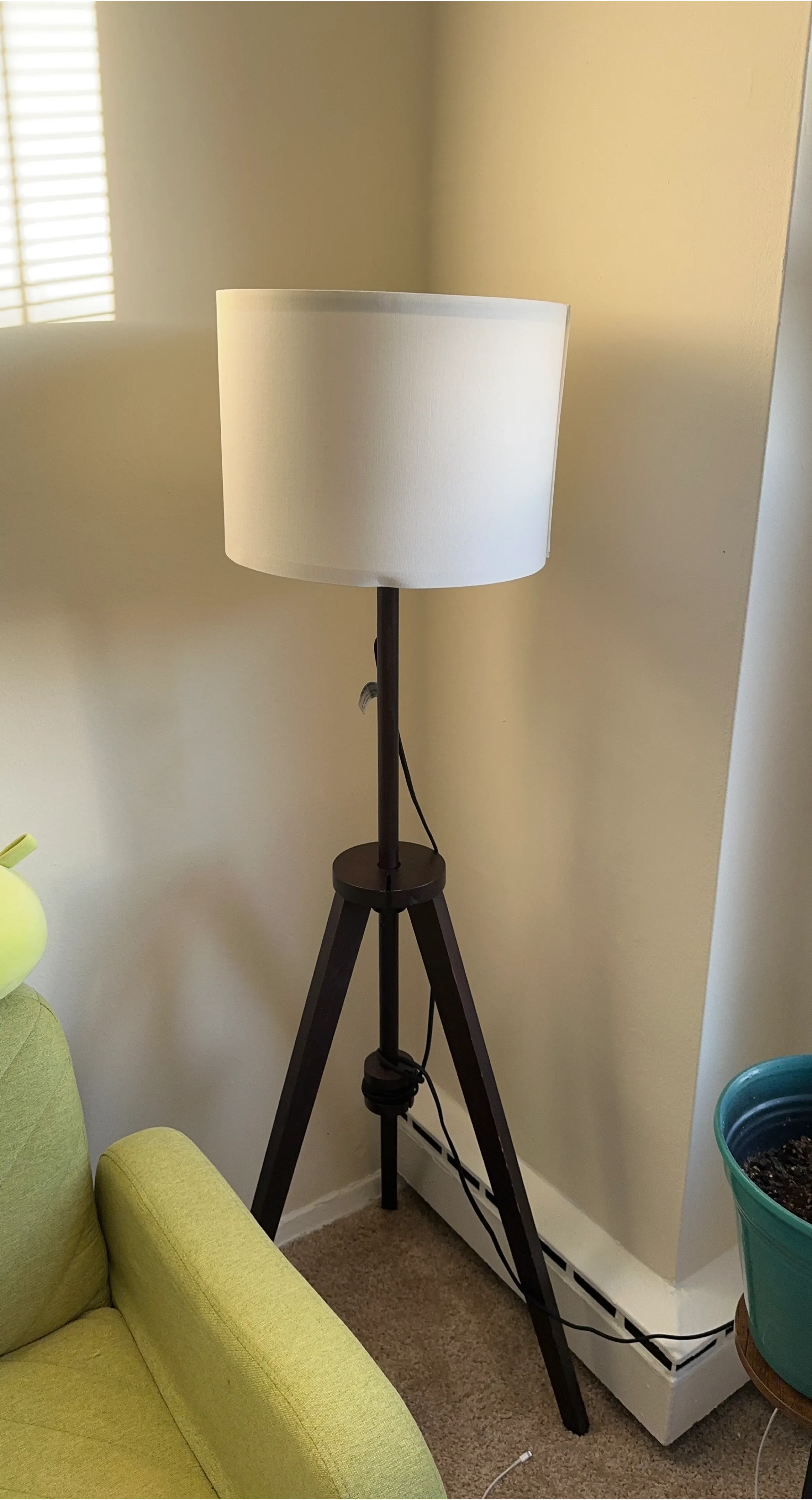 Selling a stylish tripod floor lamp! It features a dark brown wooden tripod base and a clean white shade. It's in great condition and would look great in any living room or bedroom