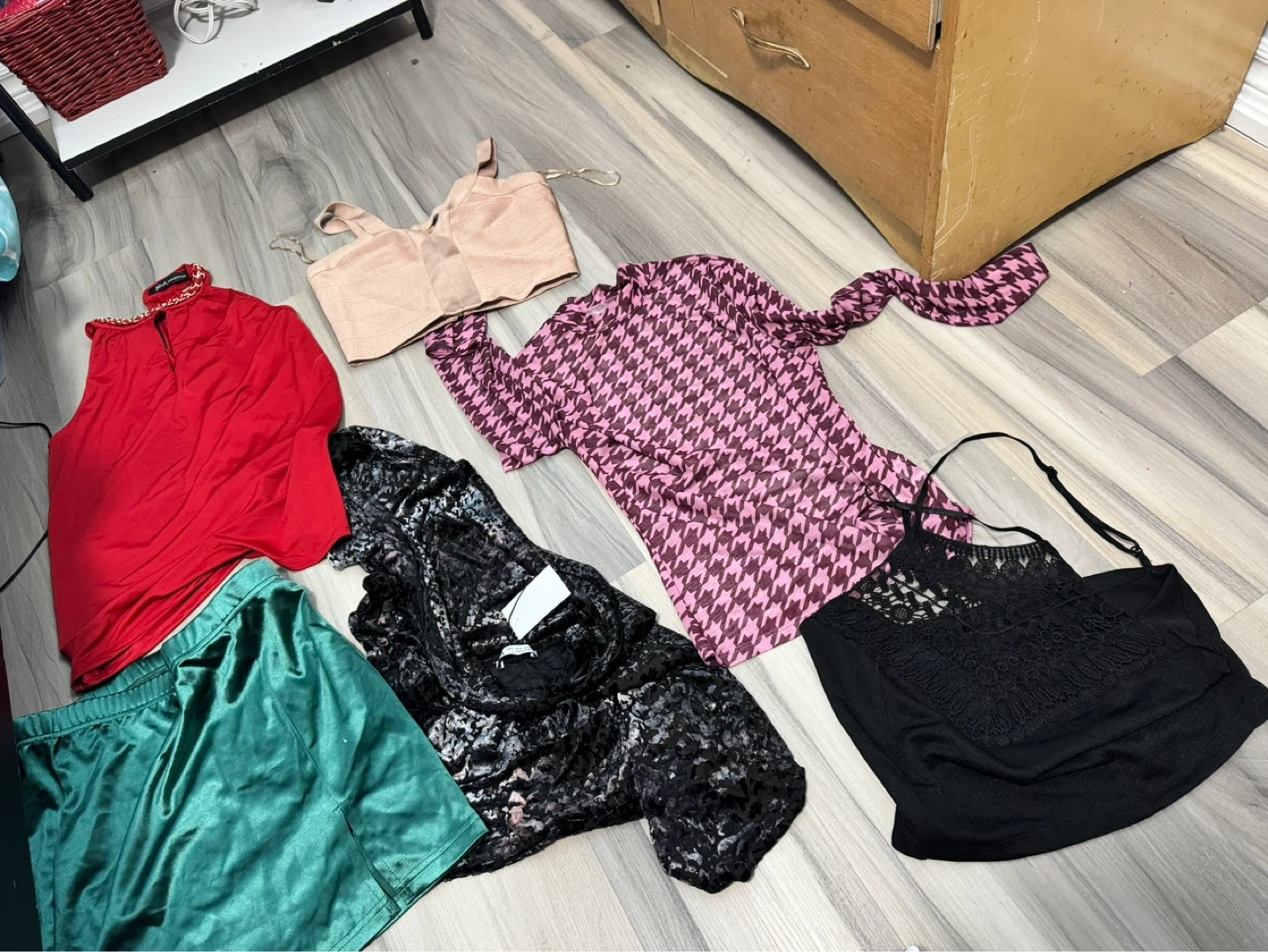 Bundle of women's apparel including a red sleeveless top with gold chain detail, a pink ribbed bustier top, a green satin skirt, a black lace-trimmed cami, and a pink and purple houndstooth print sheer cover-up. Various materials and styles included.