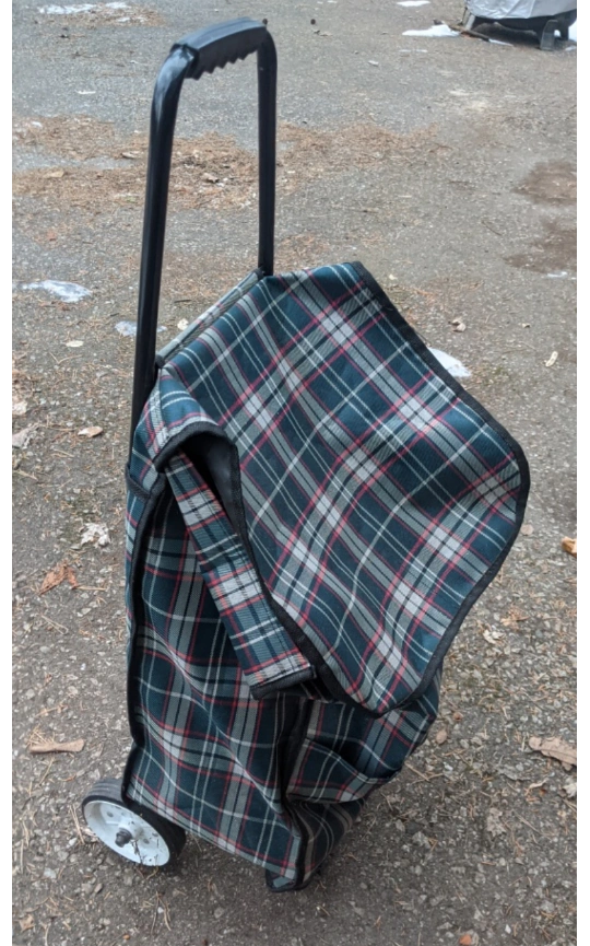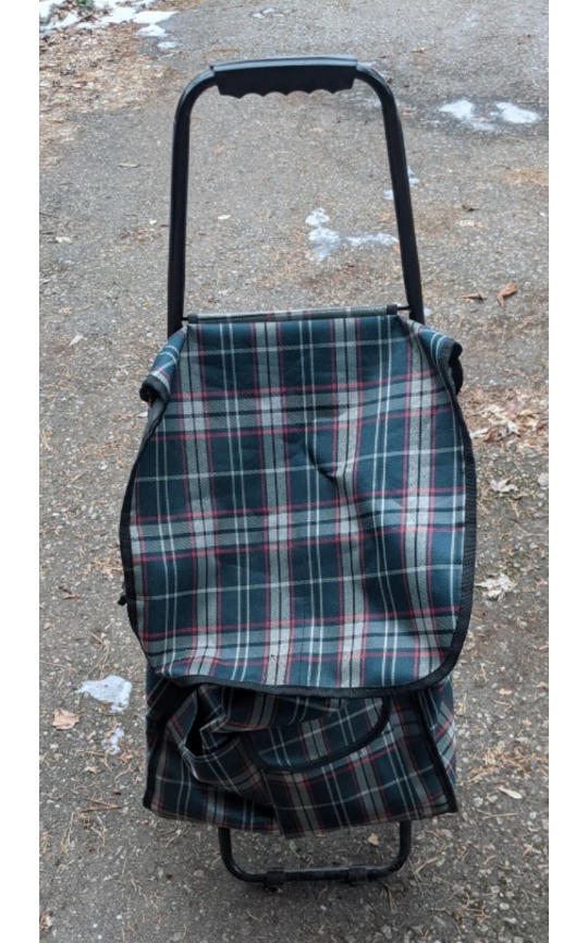 Durable shopping cart. A convenient handle and plaid fabric bag design. Ideal for grocery shopping or transporting items.