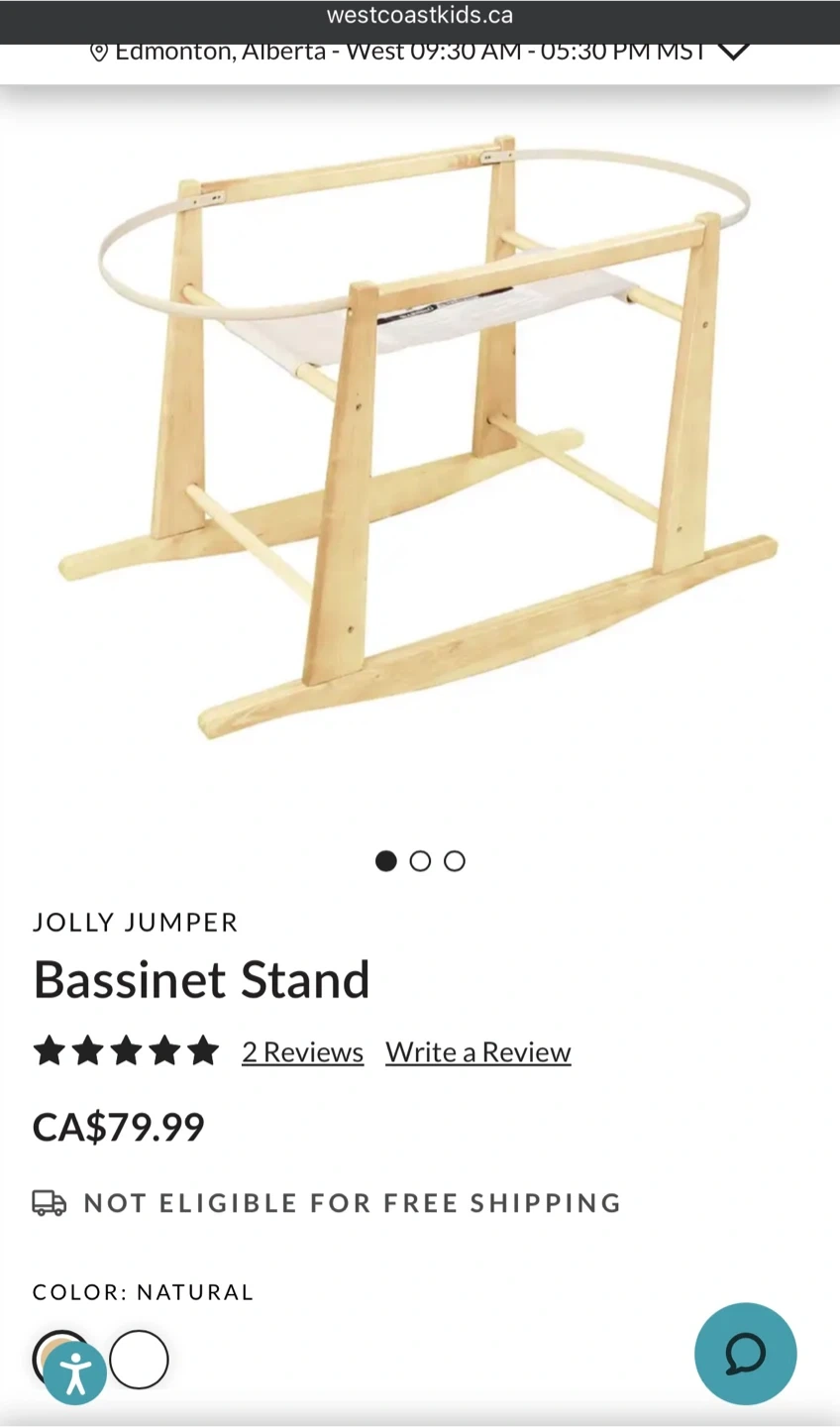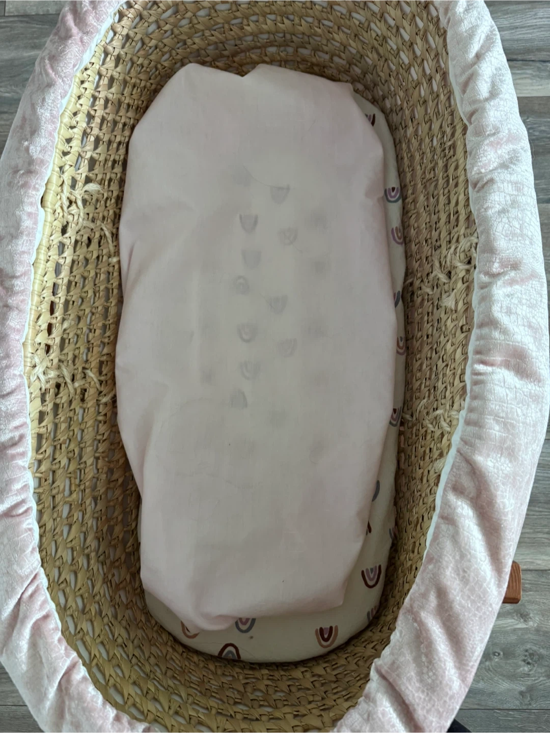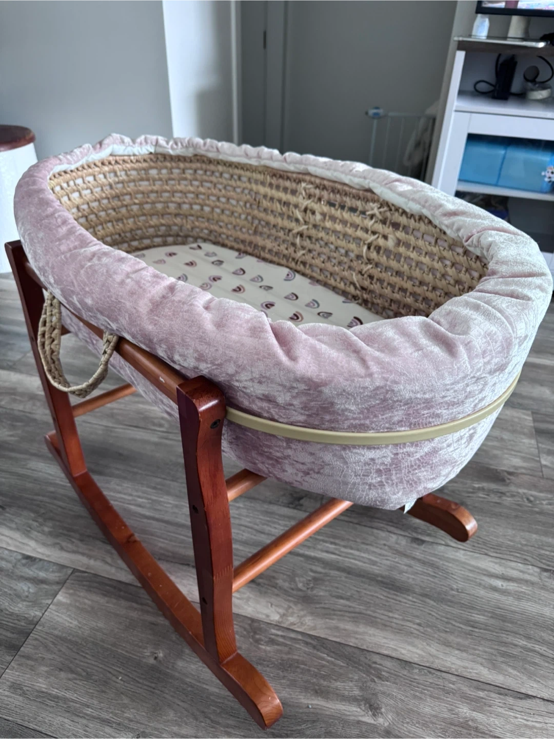 Moses basket bassinet with a woven straw base and pink velvet trim. It includes a fitted sheet with a rainbow pattern. Comes with a wooden rocking stand.