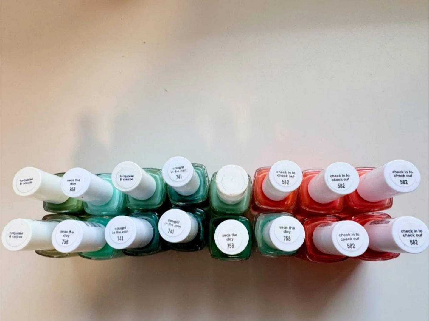 Essie nail polishes in various popular shades, including 'Turquoise & Caicos', 'Seas the Day', 'Caught in the Rain', and 'Check In To Check Out'. These are full-sized bottles perfect for adding to your collection or trying out new colours. Get a salon-quality manicure at home!