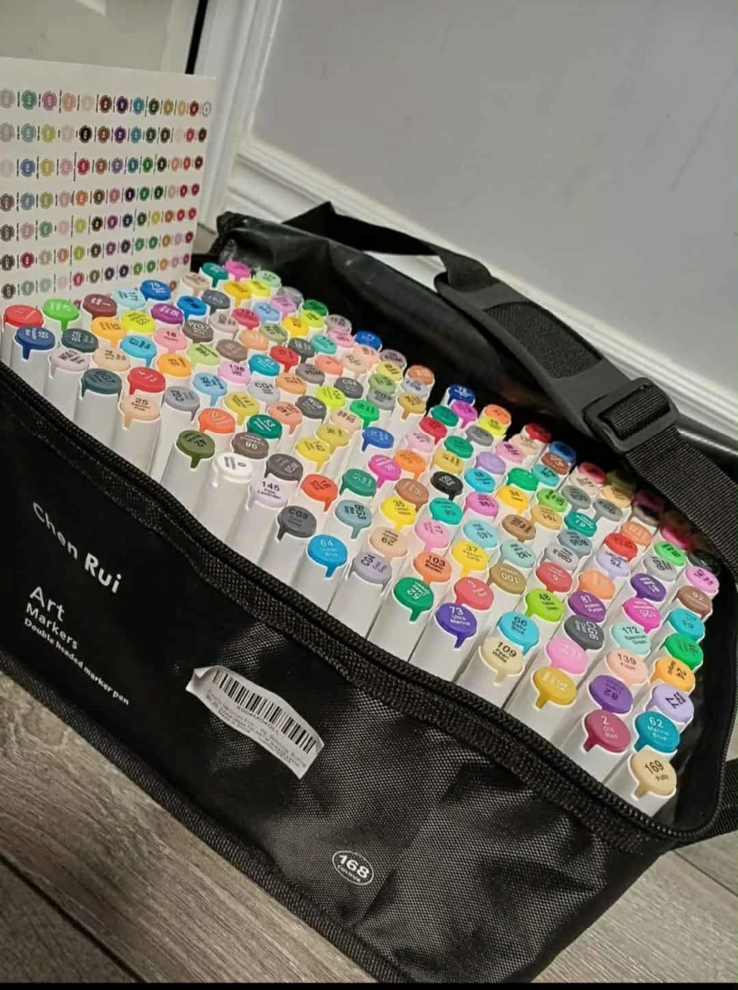 Selling a set of Chen Rui art markers, which comes with 168 different colours! These are double-ended marker pens witb vibrant colors. Perfect for artists, hobbyists, or anyone who enjoys colouring and drawing. Comes in a convenient carrying case to keep everything organized and easy to transport