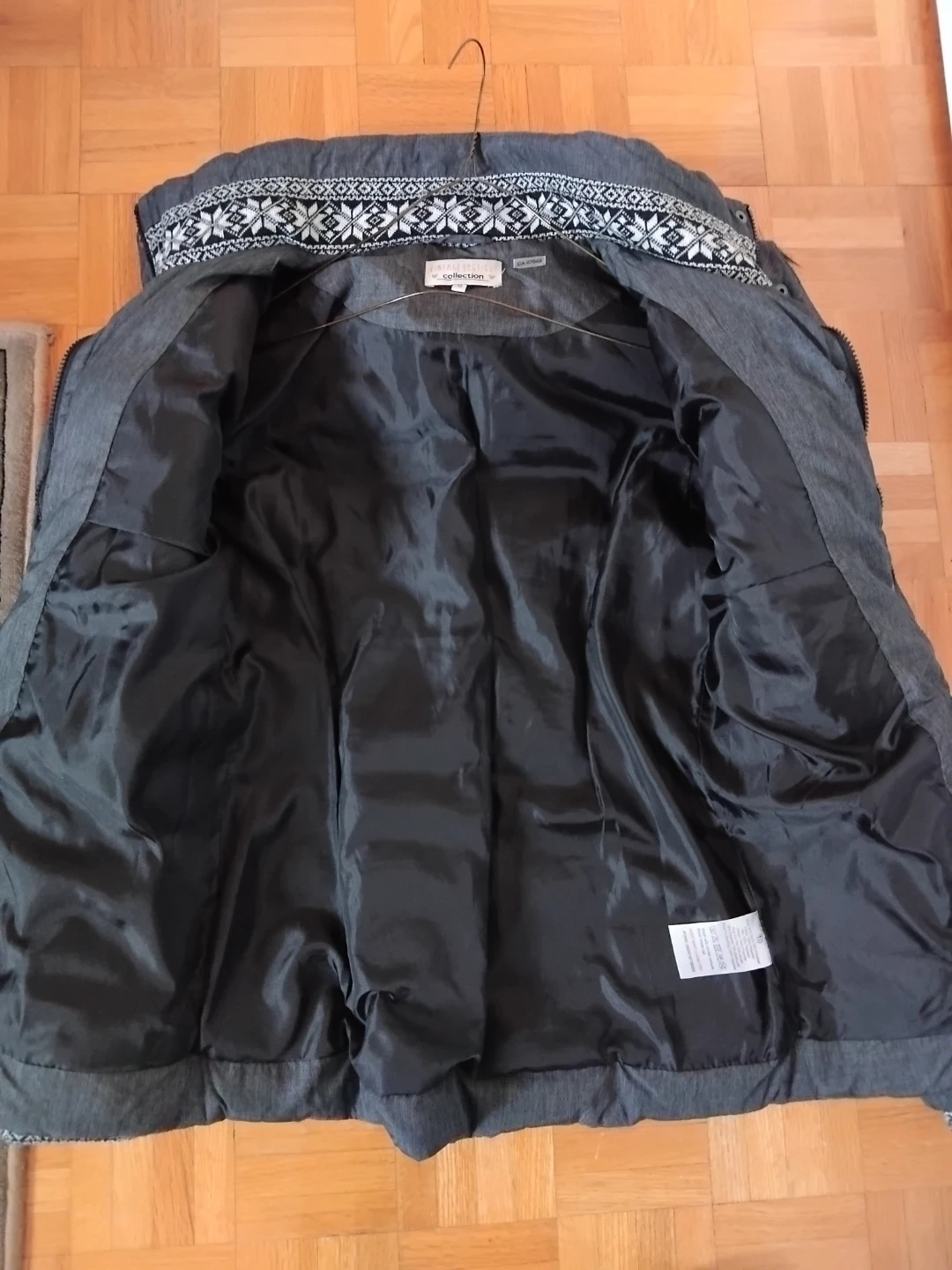 This puffer jacket is grey and features a belted waist. It's fully lined with a black satin material. The hood is trimmed with faux fur and has a decorative patterned trim around the collar. It's great for staying warm and stylish on colder days.