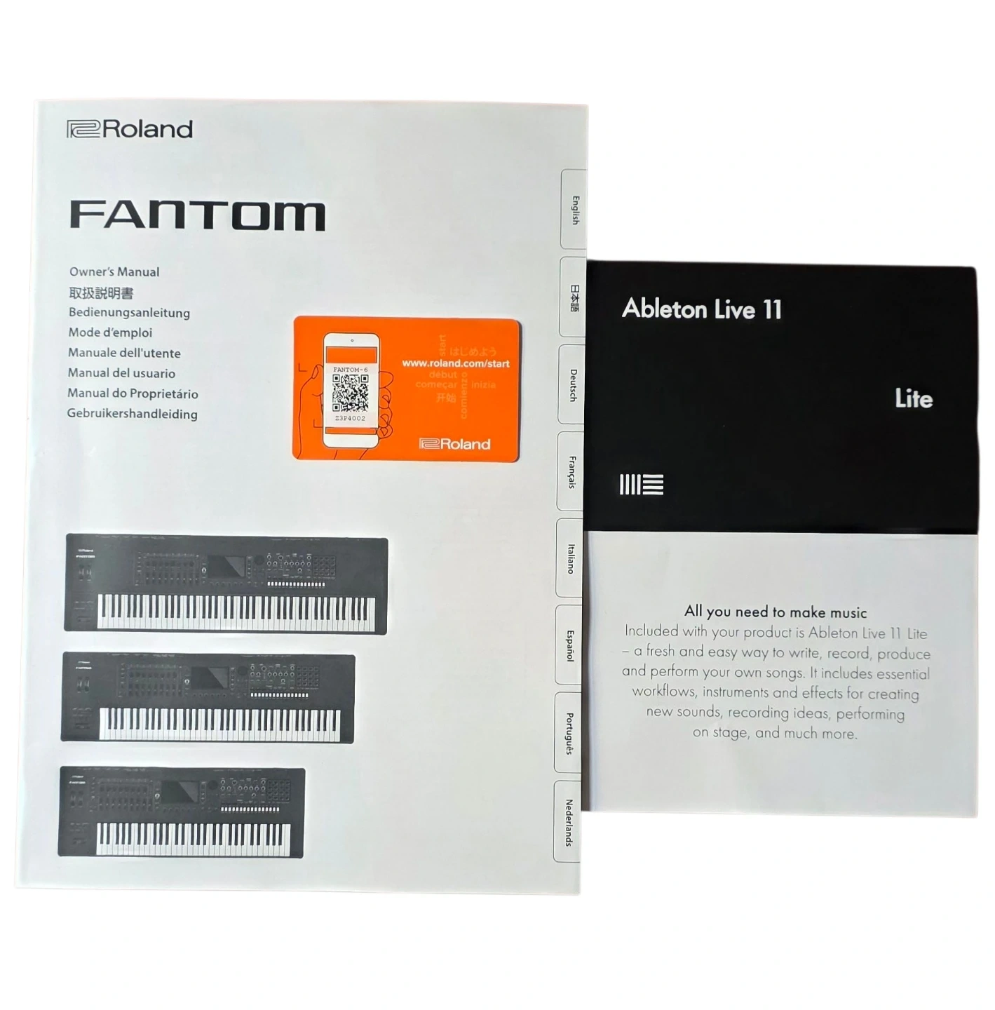 Roland FANTOM synthesizer keyboard. Includes owner's manual and Ableton Live 11 Lite software. This workstation keyboard offers a full set of controls for music production and performance.