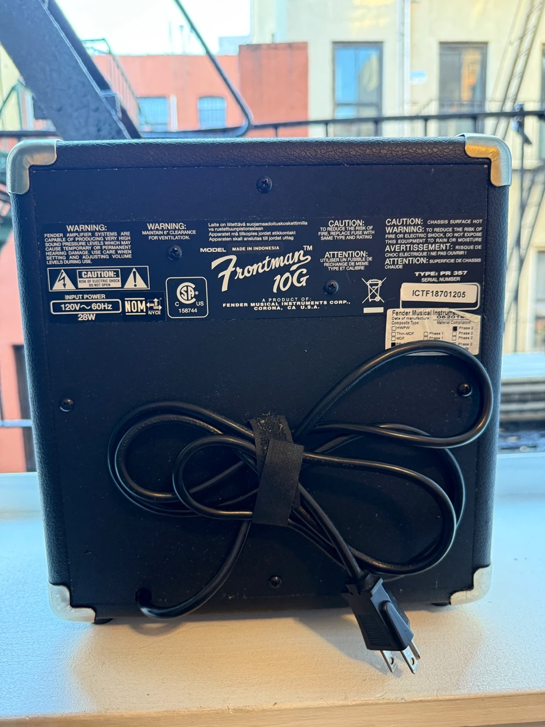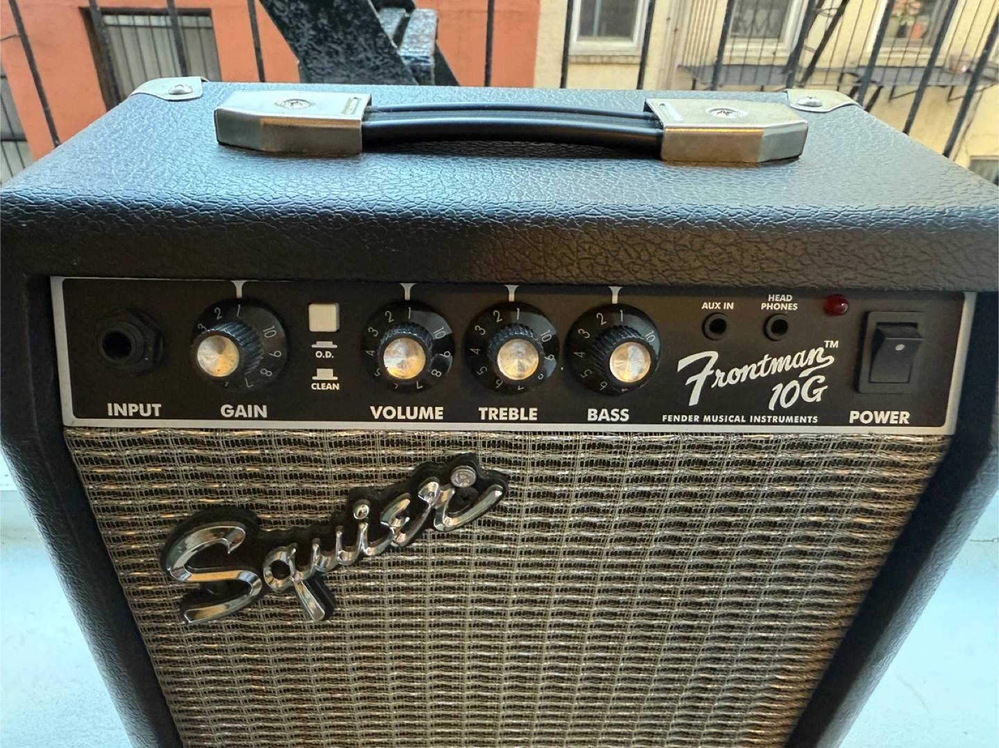 This is a Squier Frontman 10G guitar amplifier. It features input, gain, volume, treble, and bass controls. It also has an aux in and headphone jack. It's 10 watts and made in Indonesia.