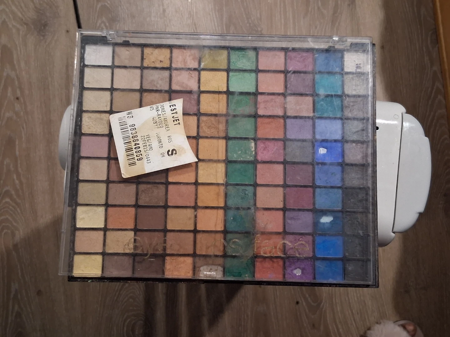 This is an Estjet eyeshadow palette with a wide range of colours. It includes numerous shades for versatile makeup looks. The palette is in a clear case with a price tag.
