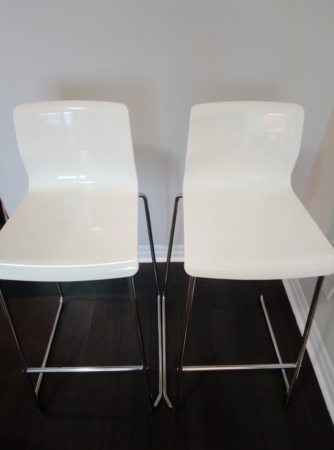Selling a set of two bar stools! They feature a sleek, modern design with a white seat and chrome legs. Perfect for adding a touch of style to your kitchen or bar area
