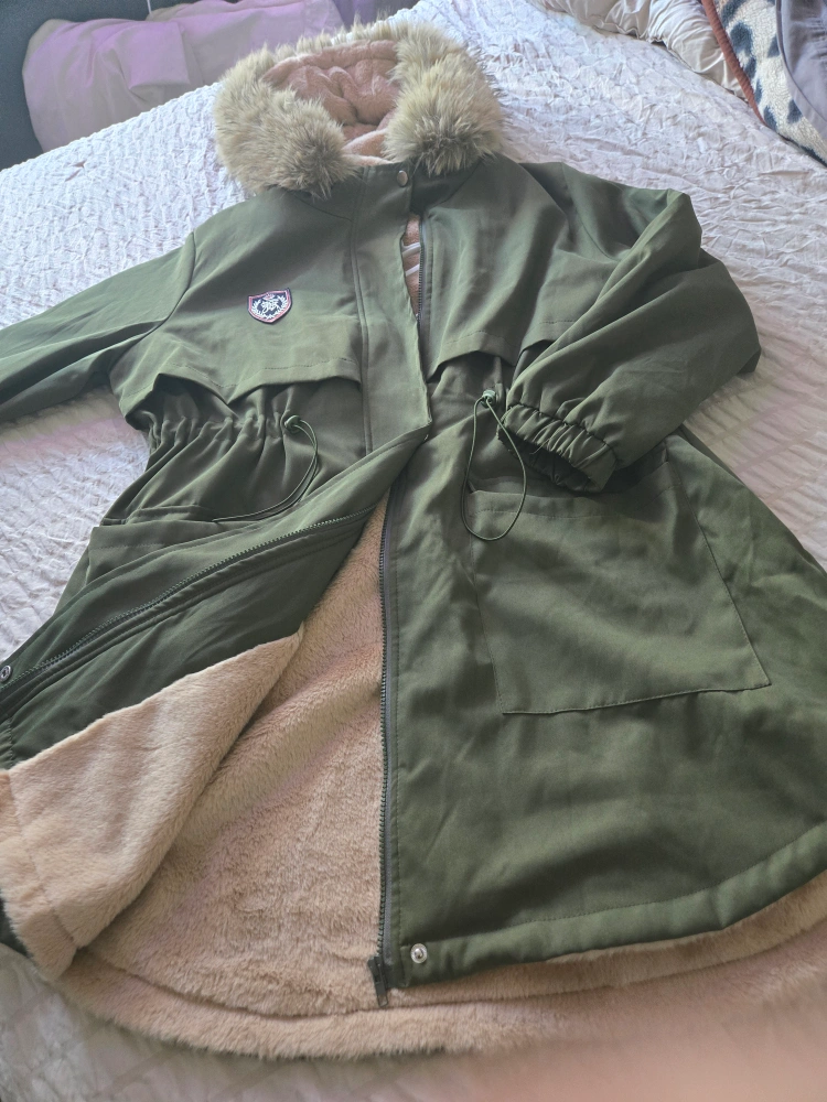 Green winter parka with fur hood and fleece lining. Has pockets and a drawstring waist.