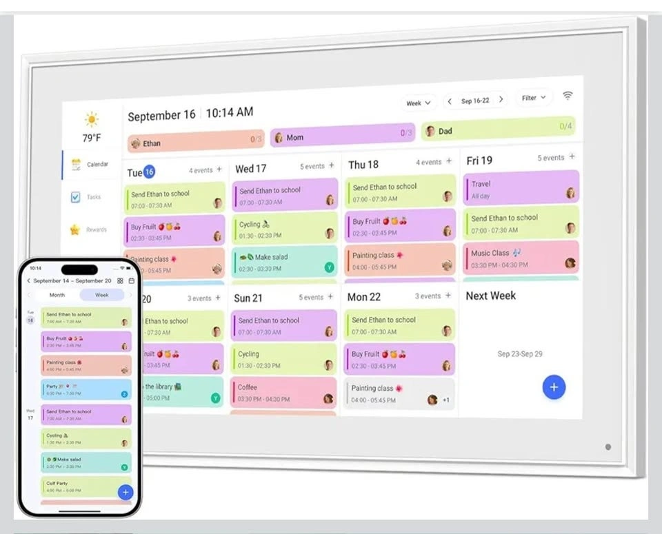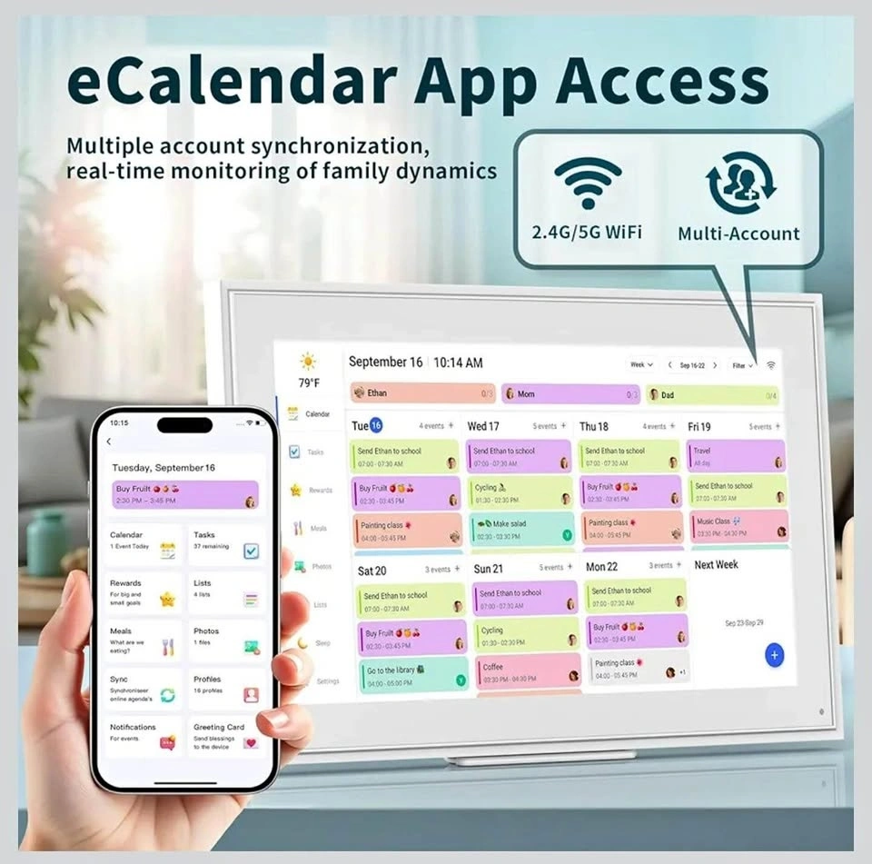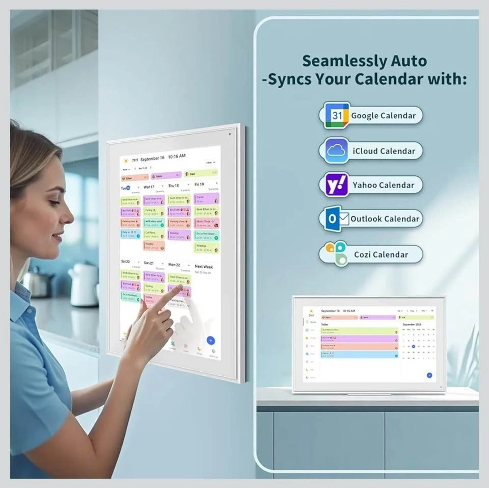 Awesome digital calendar and photo frame. Has 2.4G/5G WiFi and multi-account support. Syncs with Google, iCloud, Yahoo, Outlook, and Cozi Calendars. Helps with family organization and instant photo sharing. Keep everyone on track and share memories easily.