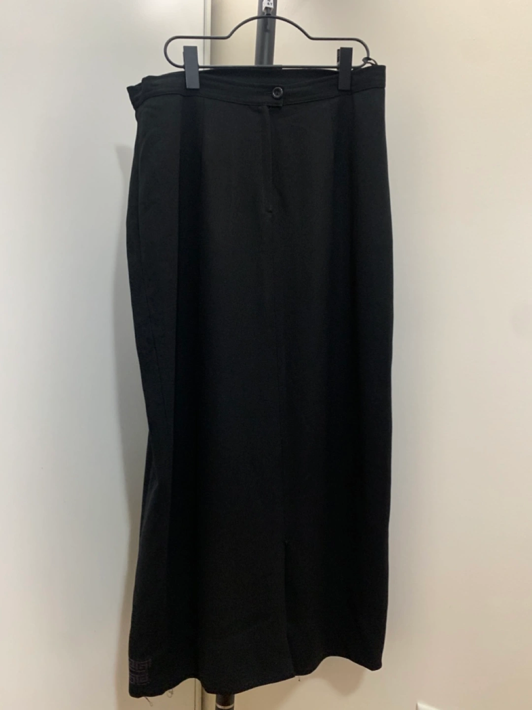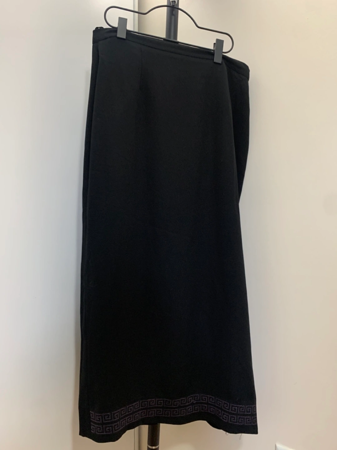 Long black skirt. Features a subtle Greek key design at the hem. Classic, elegant style. Suitable for various occasions.