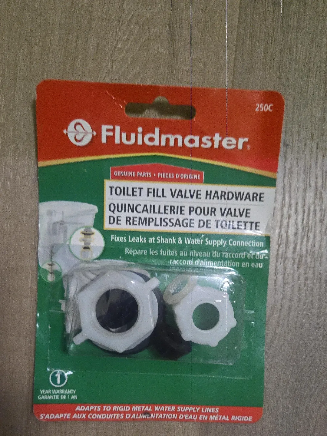 This Fluidmaster toilet fill valve hardware fixes leaks at the shank and water supply connection. It's designed for rigid metal water supply lines. It comes with a 1-year warranty.