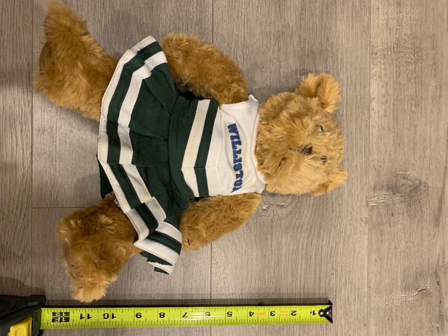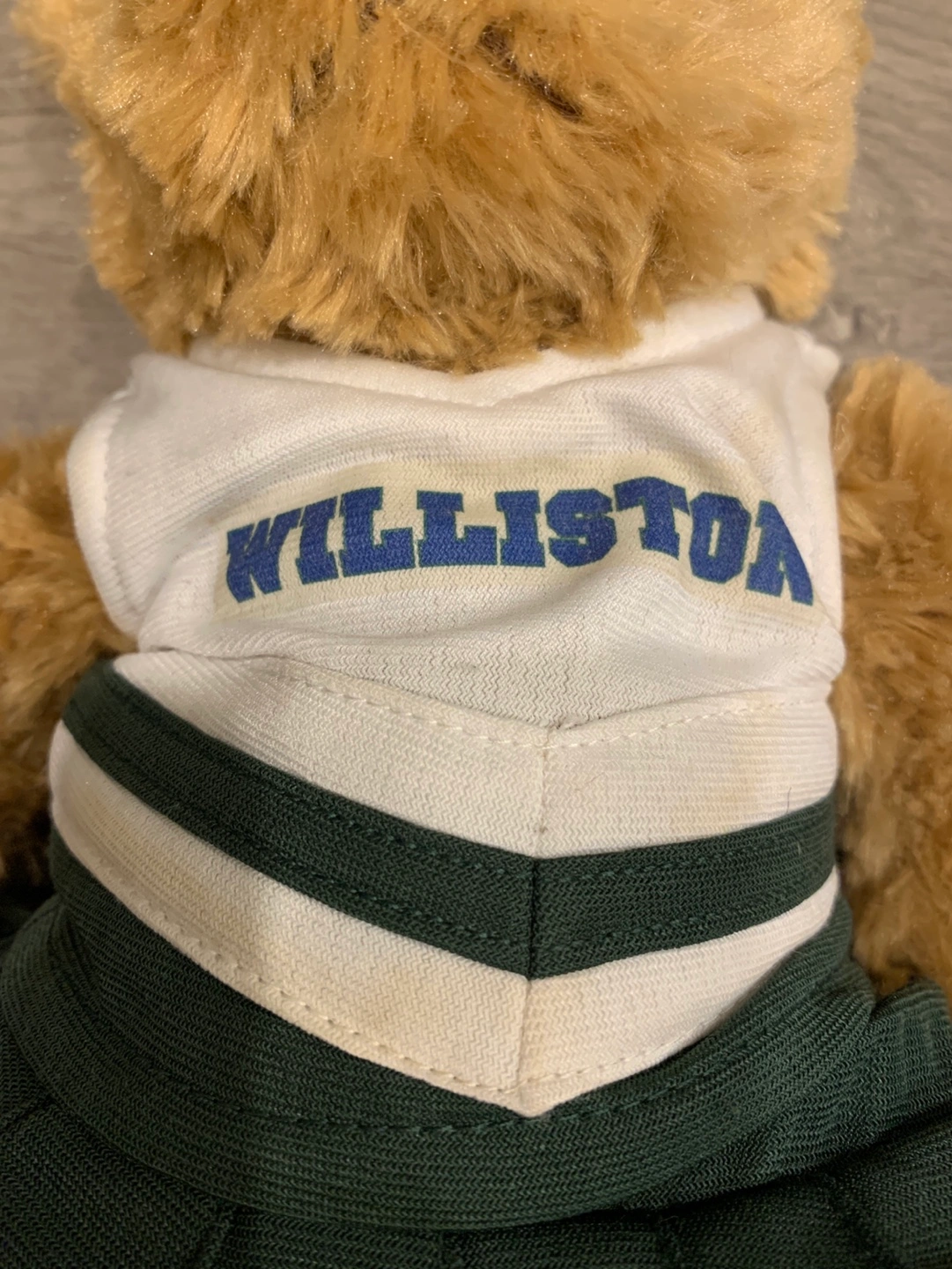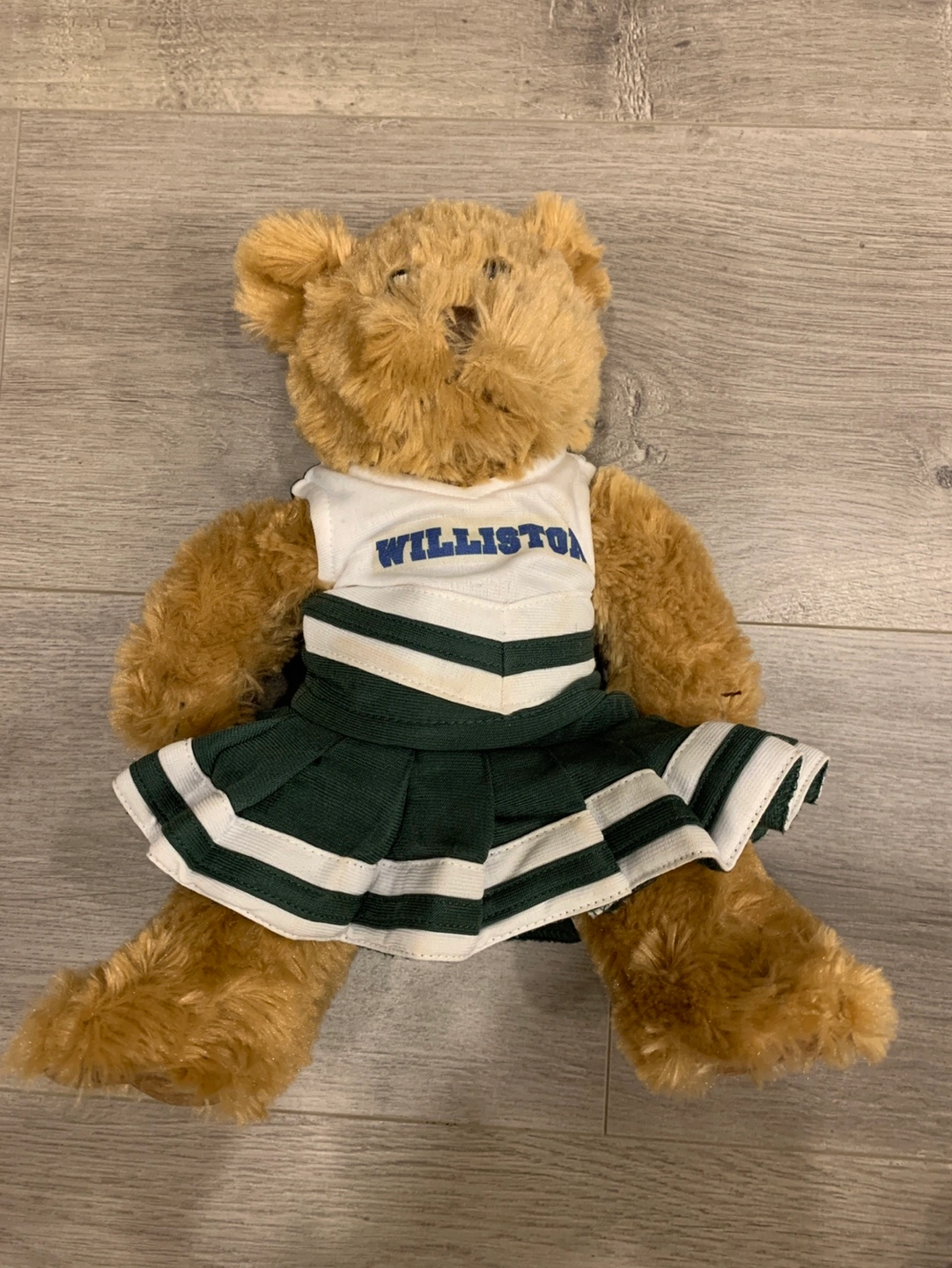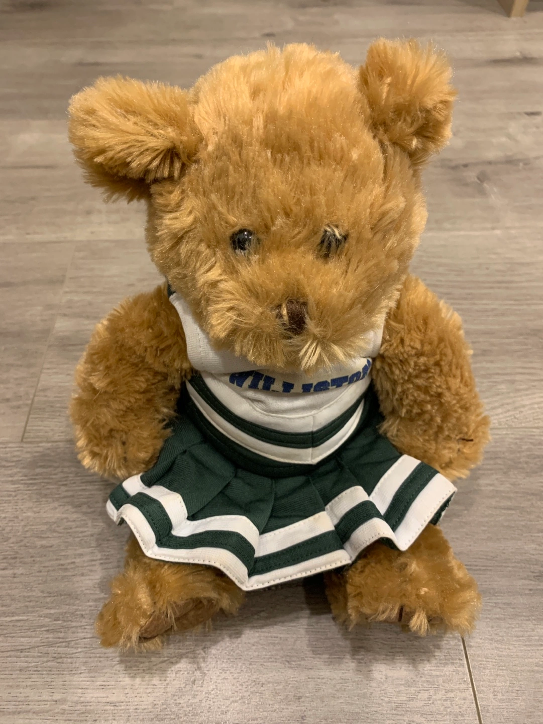 Brown plush bear wearing a white and green cheerleader outfit with a blue "Willliston" logo. Clothing is washable .