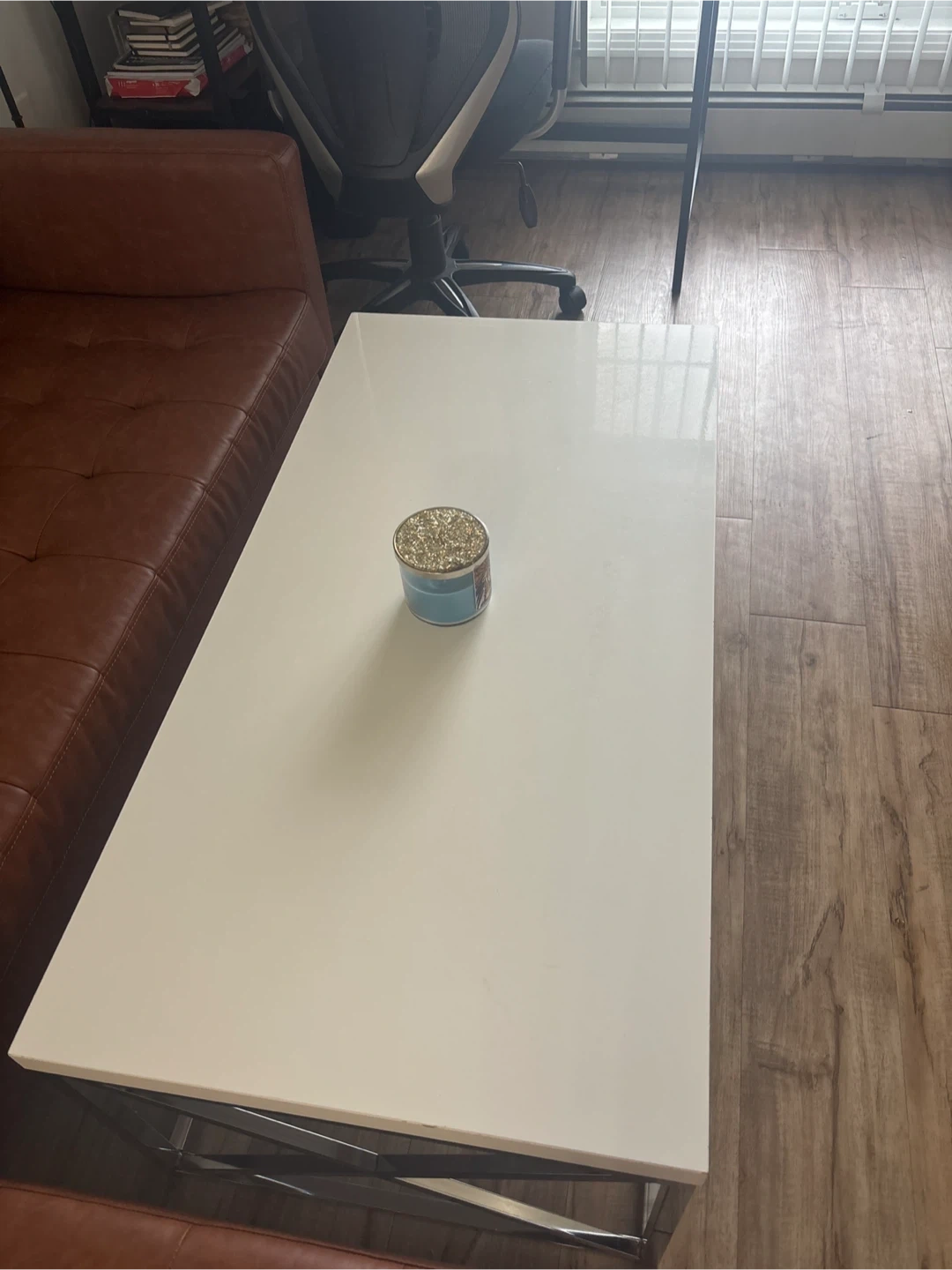 Selling a coffee table with a white top and chrome-coloured legs. There's a small chip on the edge, as shown in the photos. It's still a stylish piece for any living room!
