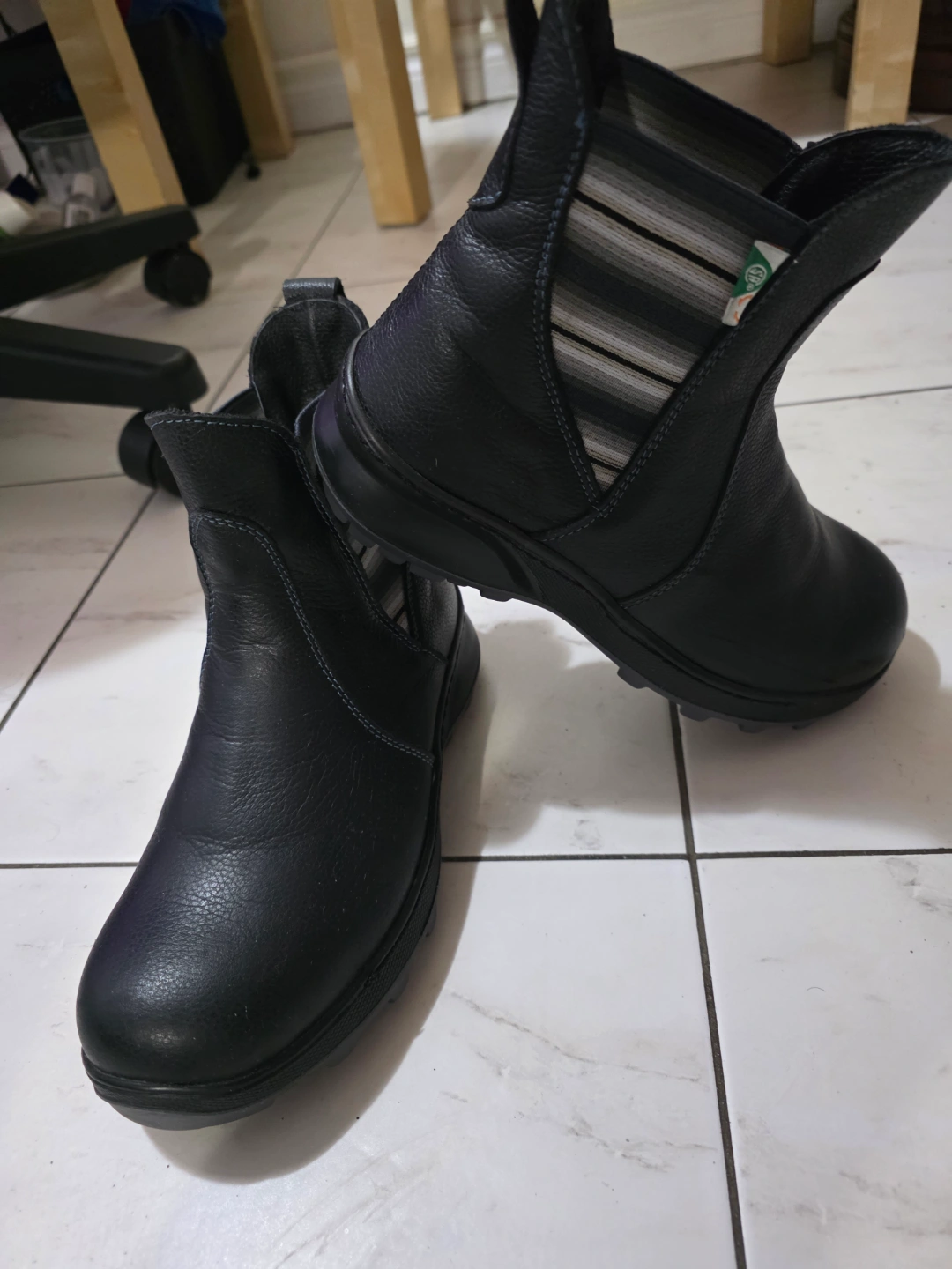 Black leather ankle boots. Elastic side panels. Striped fabric detail at the back. Chunky soles.