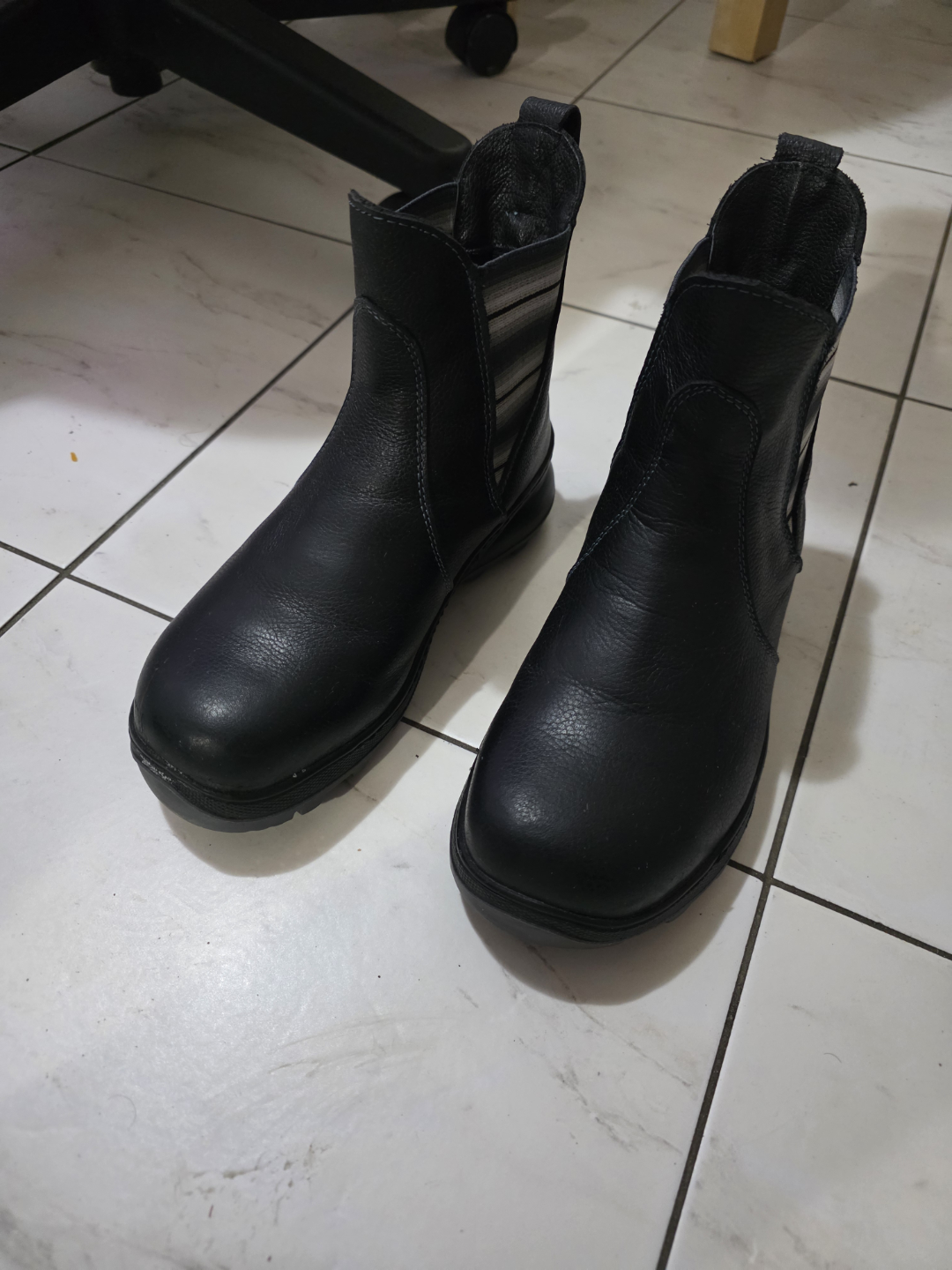 Black leather ankle boots. Elastic side panels. Striped fabric detail at the back. Chunky soles.