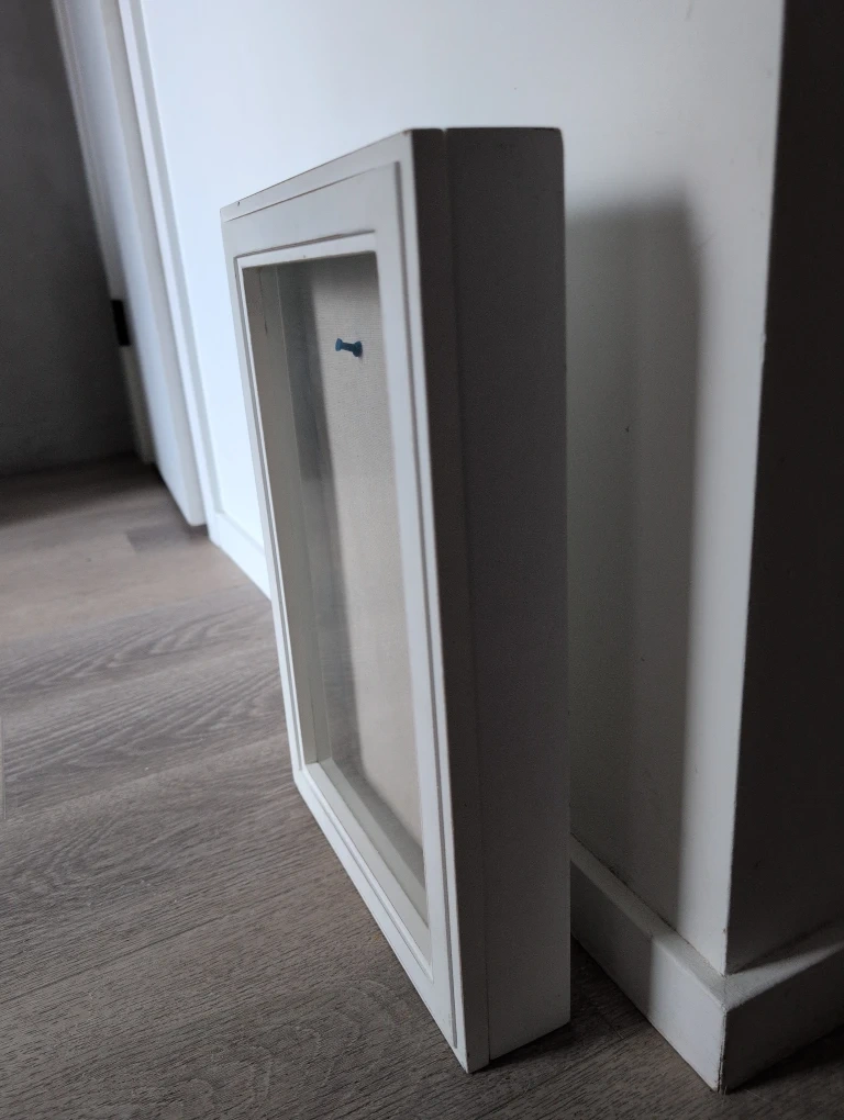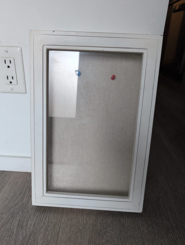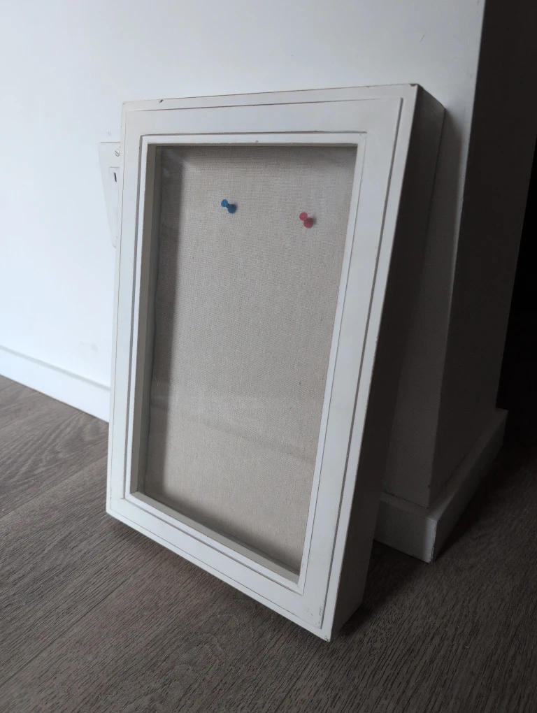 This white bulletin board/ shadow box/ memory box features a glass door and a fabric-covered backboard, perfect for displaying notes or photos. It's wall-mountable for convenient organization. Includes two pushpins you can hang things how ever you like inside the box .