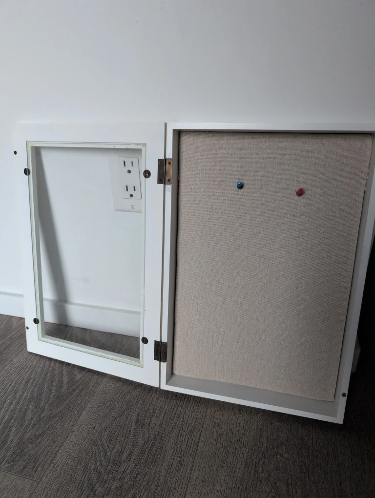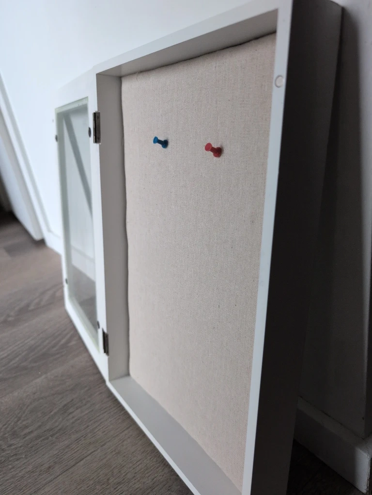 This white bulletin board/ shadow box/ memory box features a glass door and a fabric-covered backboard, perfect for displaying notes or photos. It's wall-mountable for convenient organization. Includes two pushpins you can hang things how ever you like inside the box .