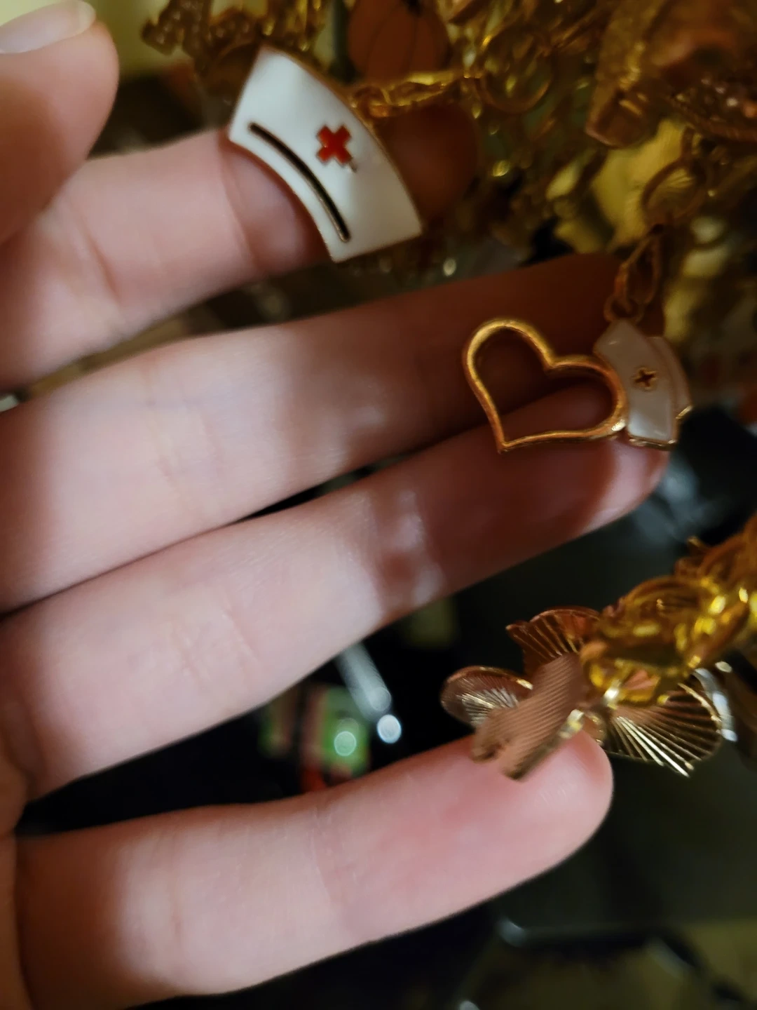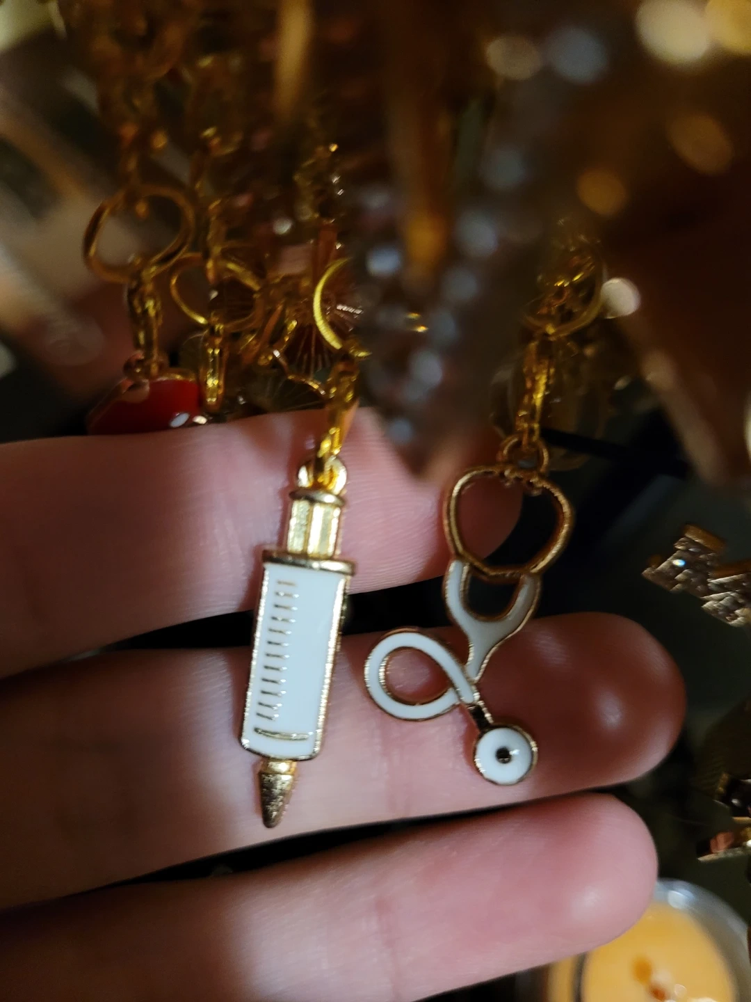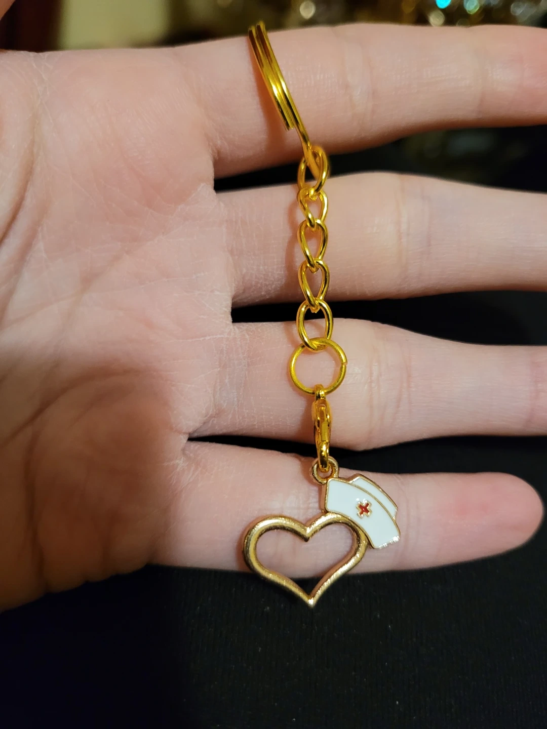Set of gold-tone keychains with various nursing-themed charms. Includes charms like a stethoscope, syringe, nurse hat, and heart. These charms add a unique touch to your keys or bag!