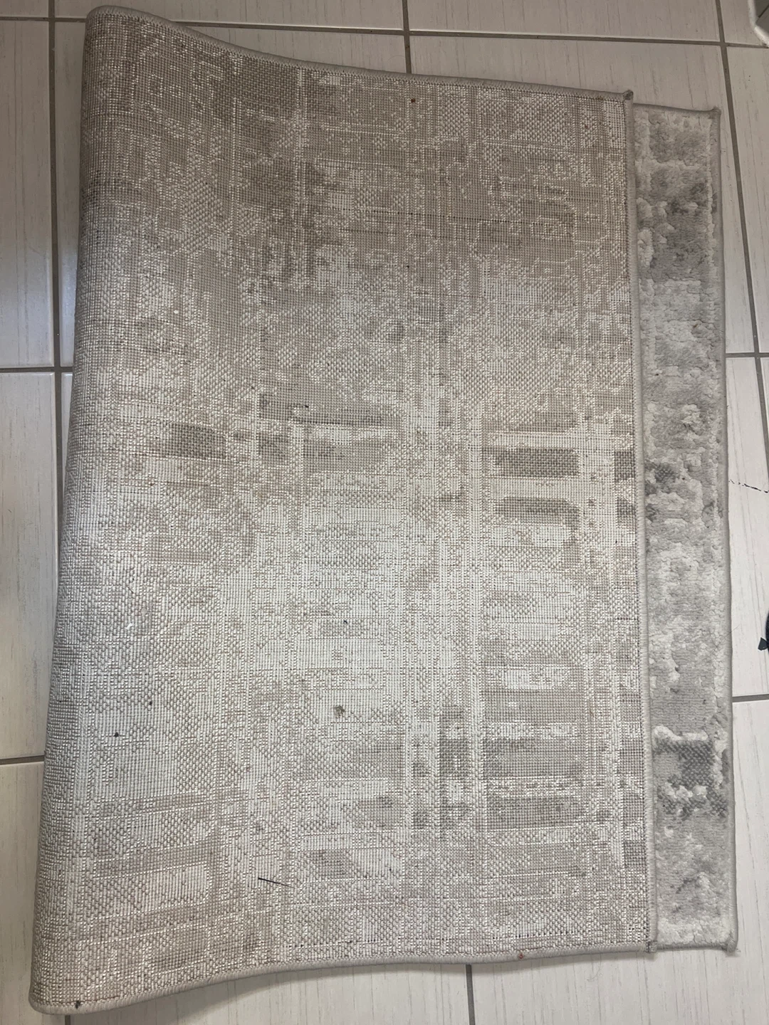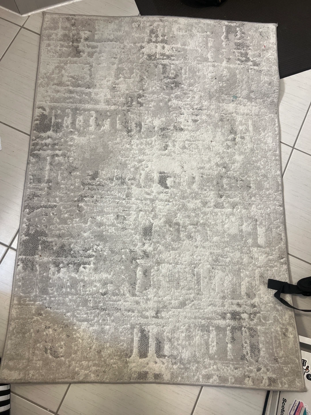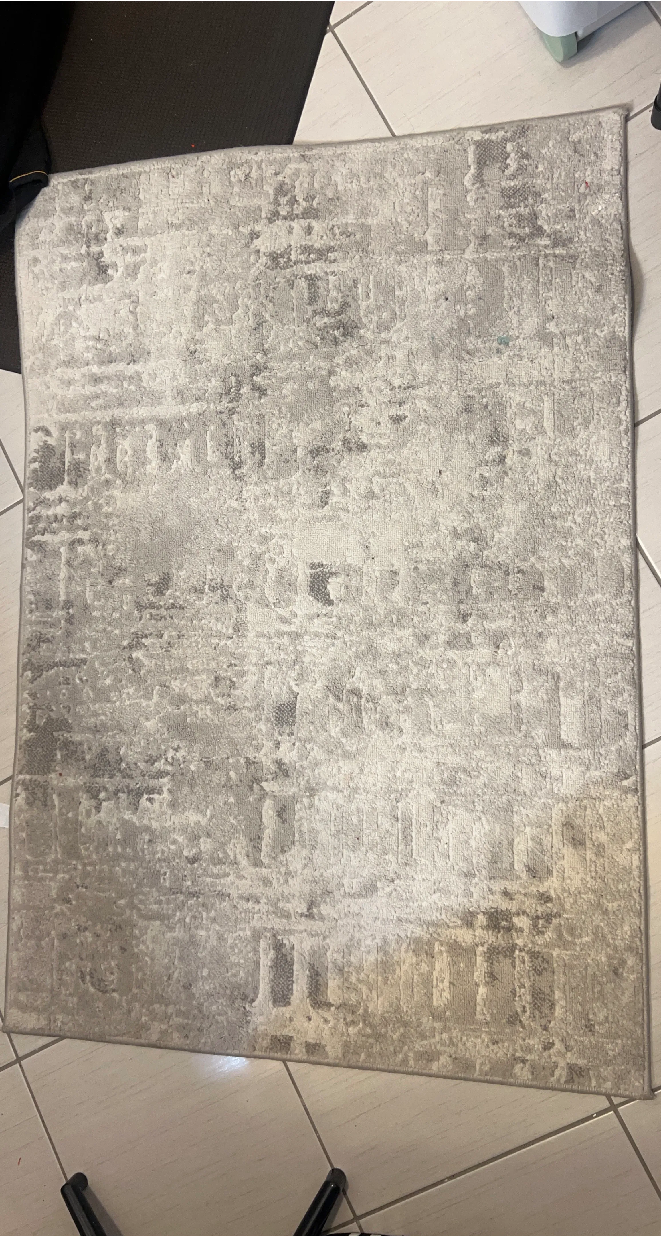 A textured area rug with a distressed grey and white abstract pattern. It's approximately 5'x7' in size. Suitable for adding a modern touch to any living space.