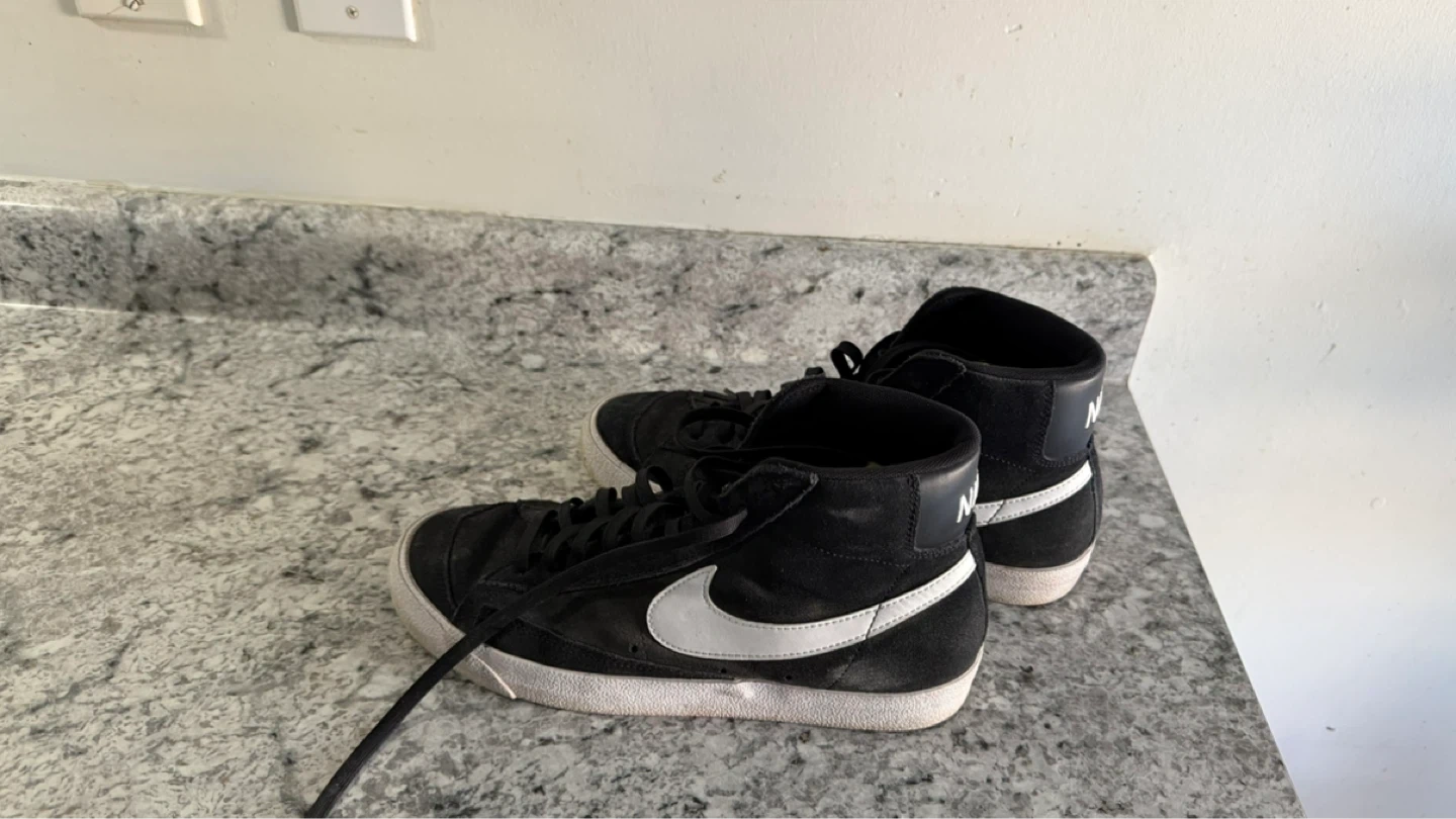 These Nike Blazer Mid '77 Vintage sneakers are black with a white swoosh. They're a classic high-top style. The rubber sole provides good grip.