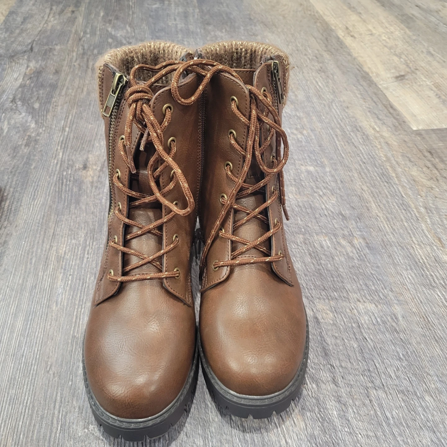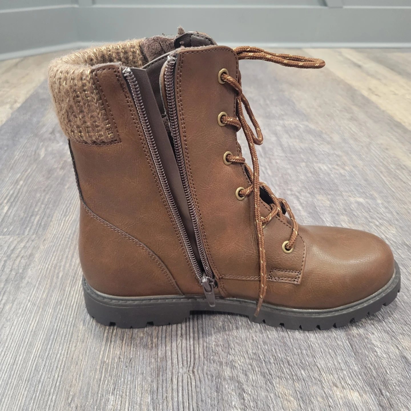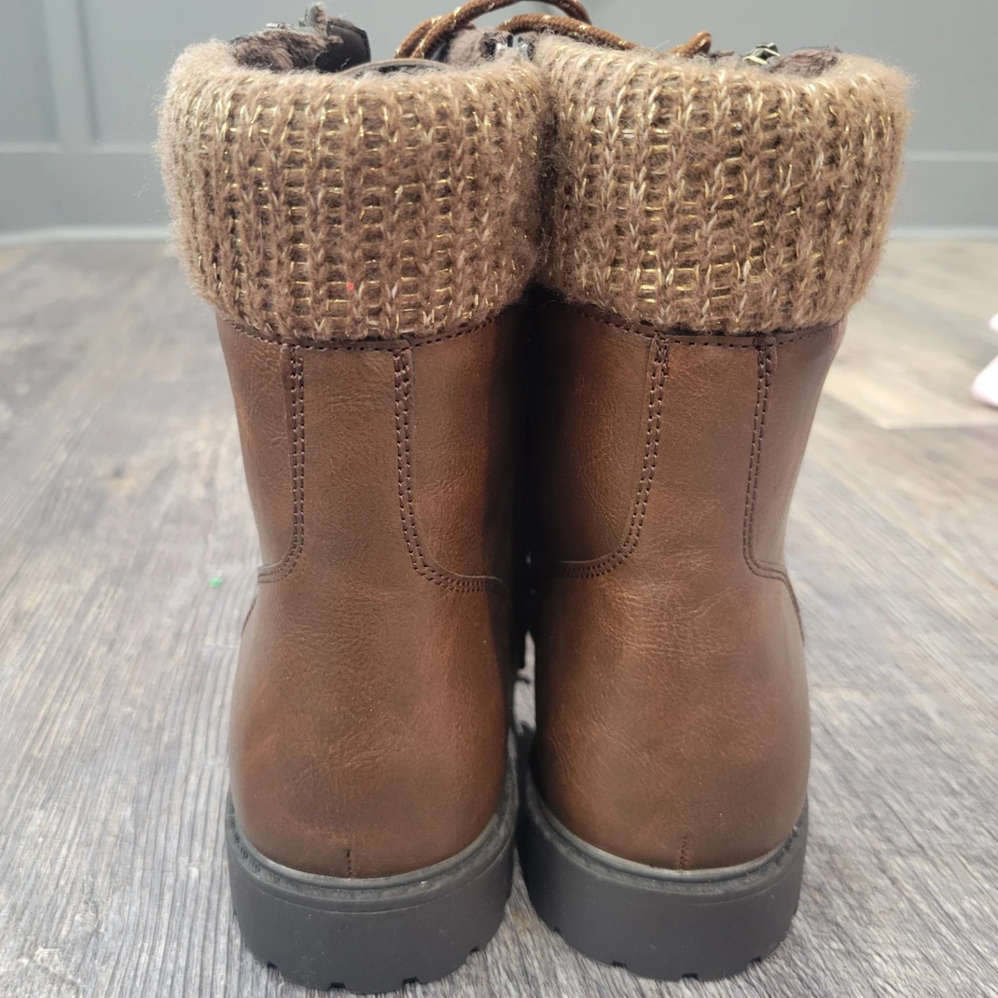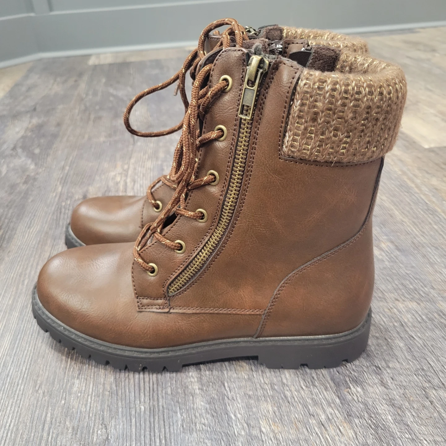 Warm brown winter boots with a cozy knit cuff and side zippers. They feature a sturdy lug sole for good grip. Great for keeping your feet toasty on colder days! Girls size 4 never worn! Pick up Brampton or can meet in Georgetown.