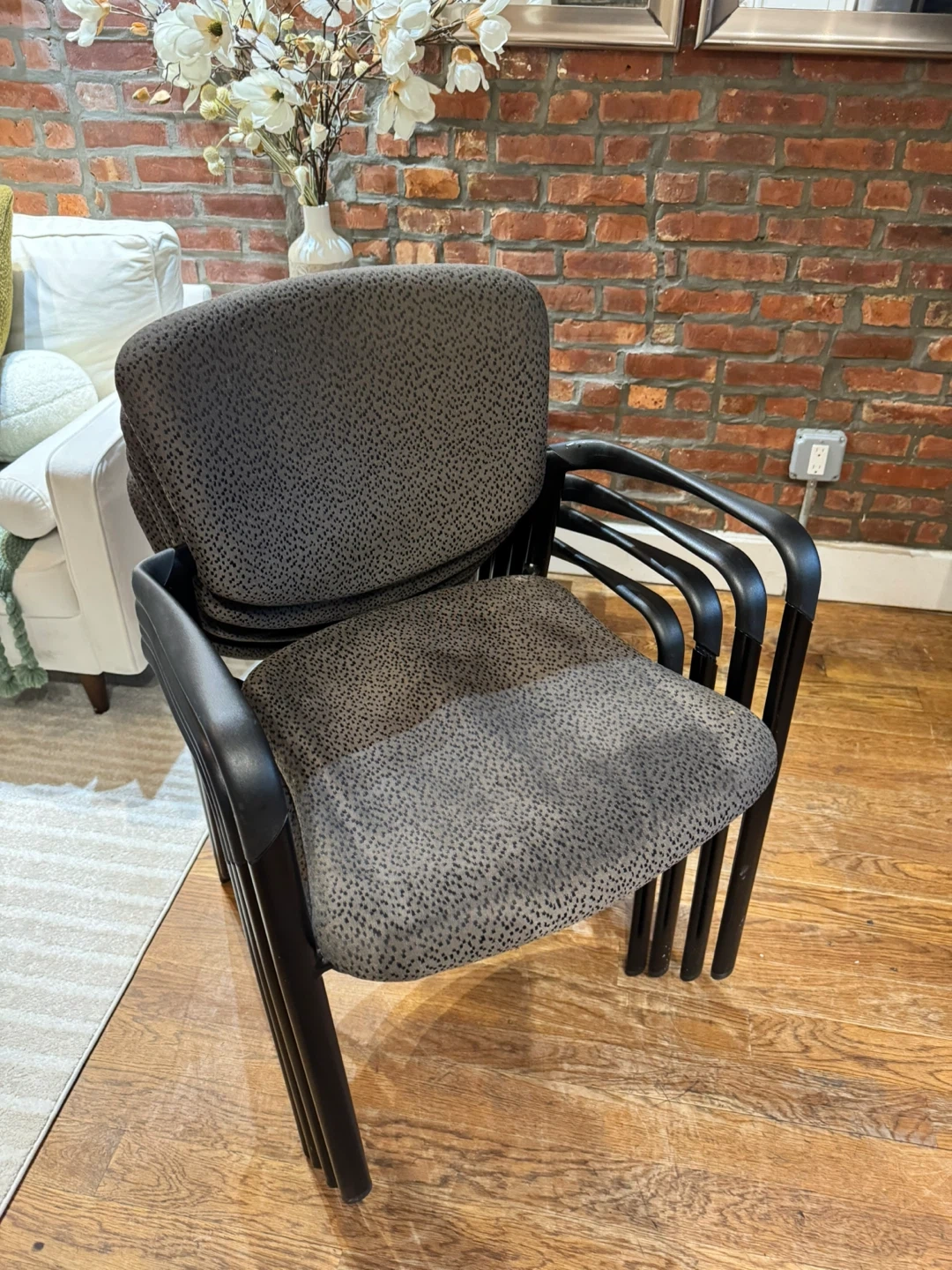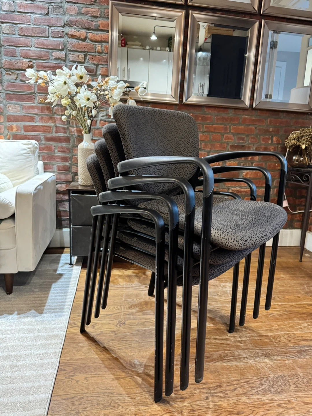 A set of four stacking arm chairs. Upholstered seats and backs with a speckled gray pattern. Black metal frame and armrests. These chairs are great for adding extra seating.