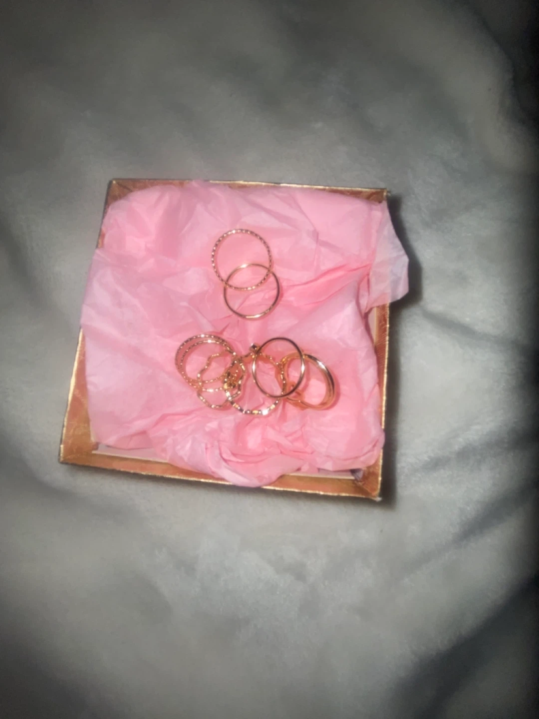 Selling a set of fake gold rings. They come in a variety of styles and sizes, perfect for stacking or wearing alone. Comes with the box