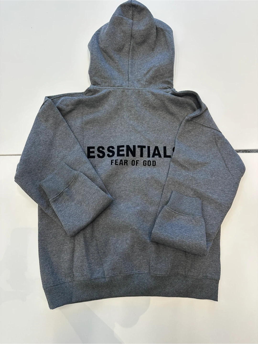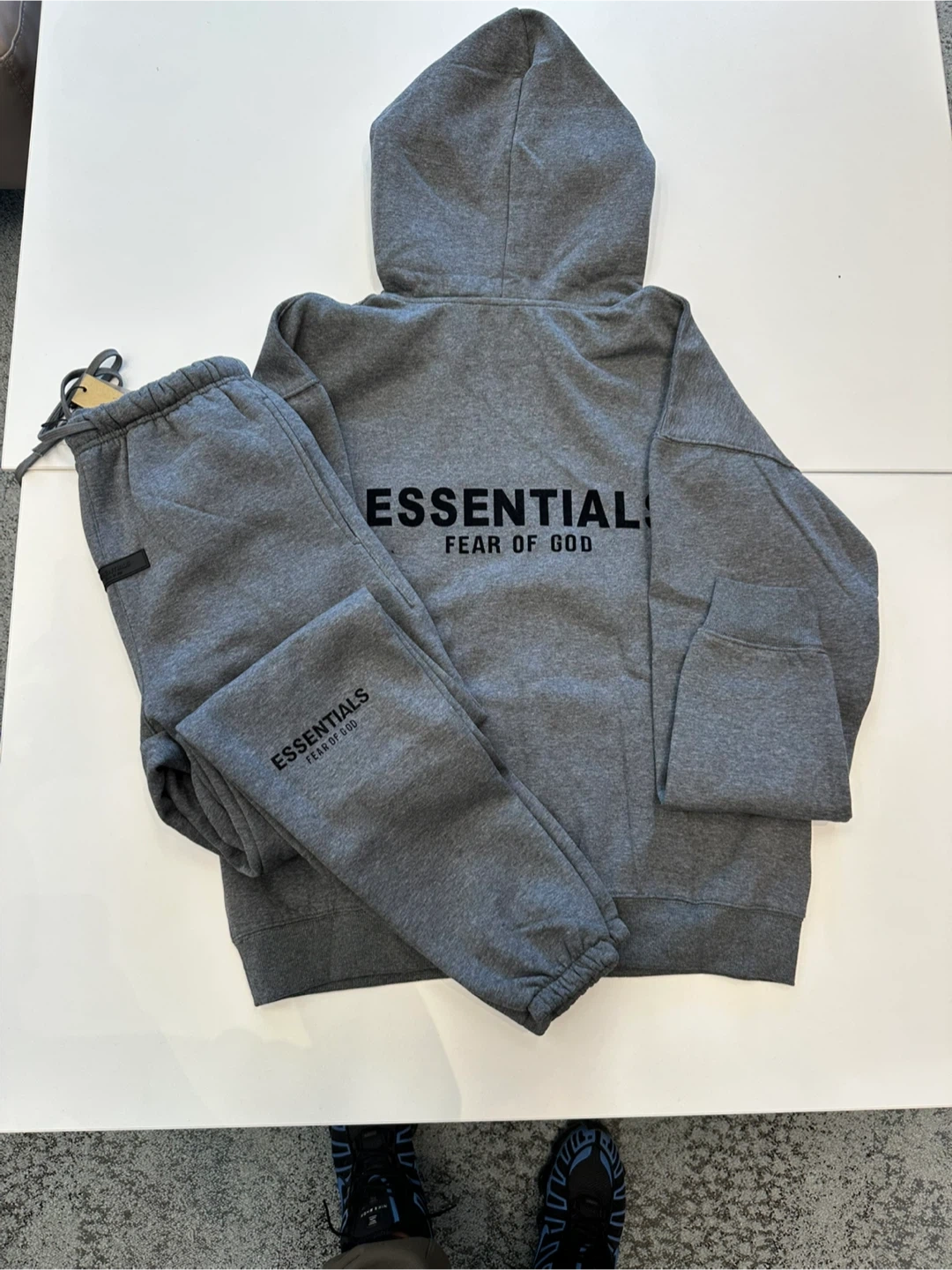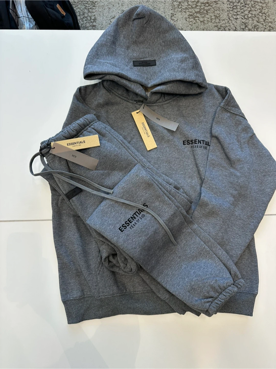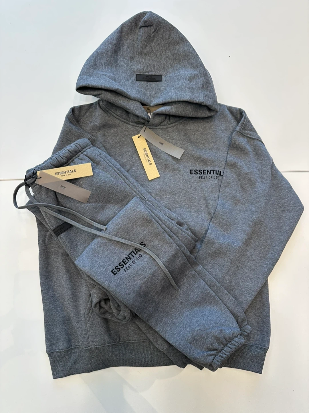 Grey hooded sweatshirt and matching sweatpants set from Fear of God Essentials. Both pieces feature embroidered "ESSENTIALS FEAR OF GOD" logo detail. This comfortable set is great for casual wear.