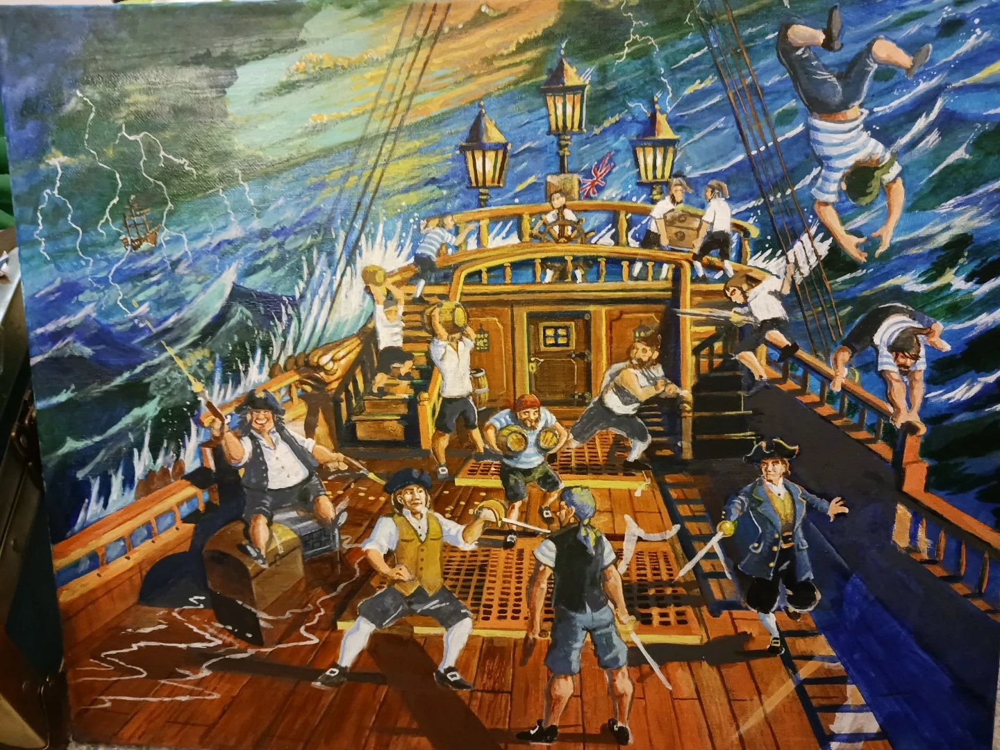 Here's a vibrant painting of a pirate ship battling a stormy sea! The artwork features many figures on deck during a storm. It would be a great addition to any room!