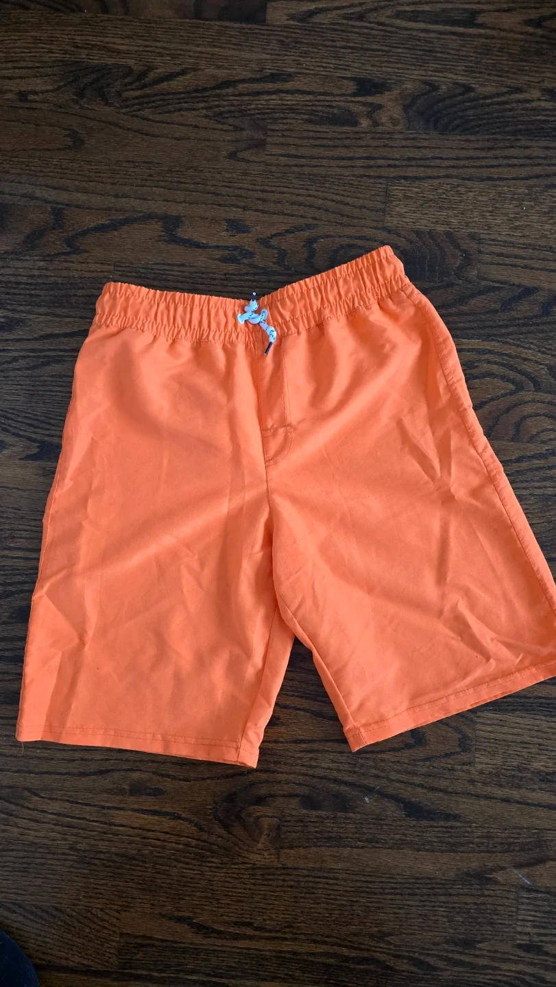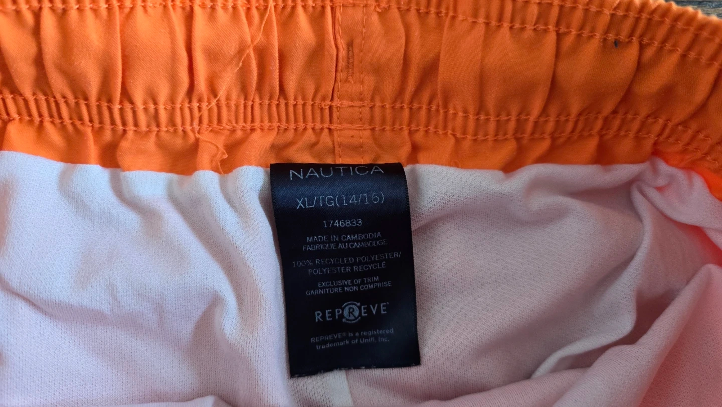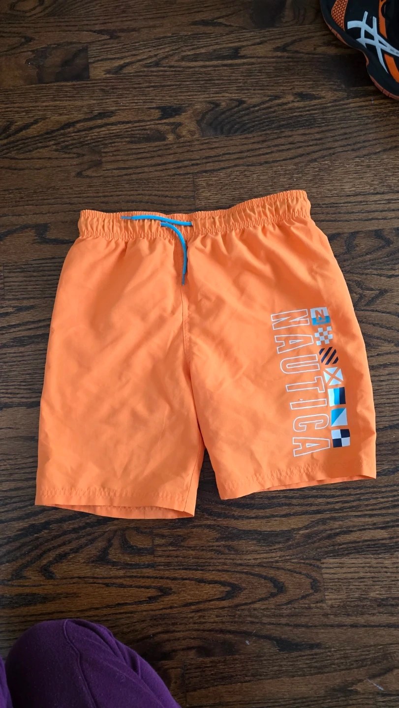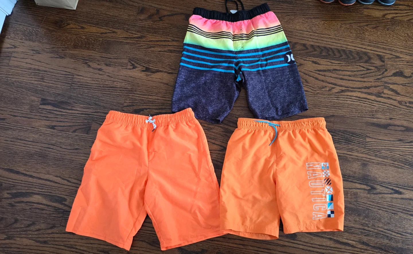 Bundle of three pairs of boys' swim trunks. Includes one pair of Hurley brand trunks with a colourful striped design and a black base. Also includes pair of Nautica brand orange trunk, one with a side graphic. Both brands are size 14/16. Great for summer fun!