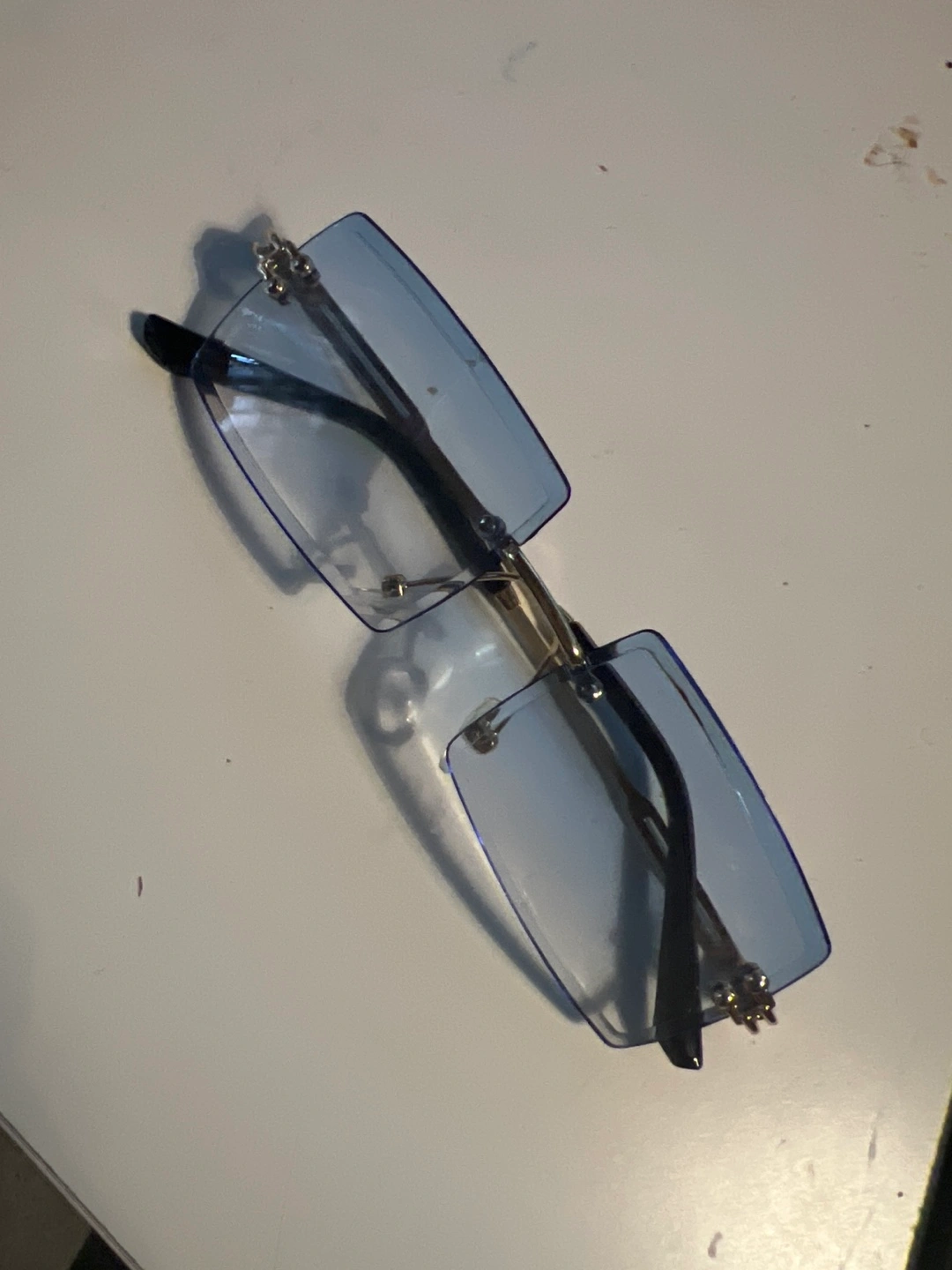 Selling a pair of stylish rimless rectangular sunglasses. The lenses are a cool blue colour. These sunglasses are in good condition and ready for a new owner!