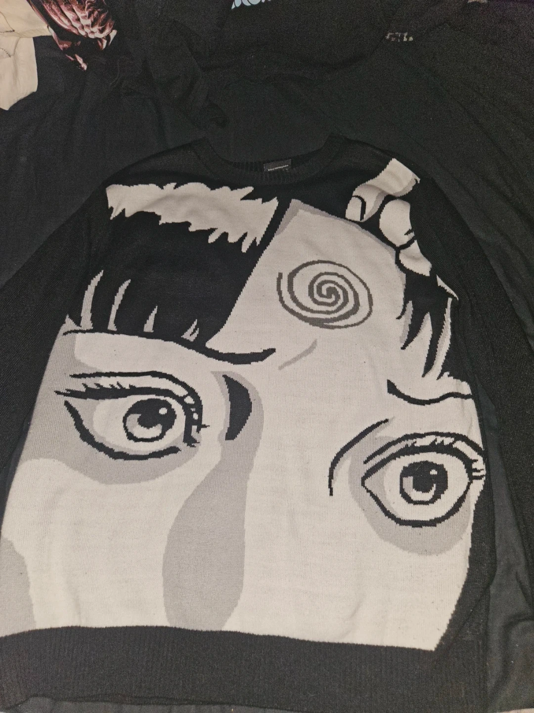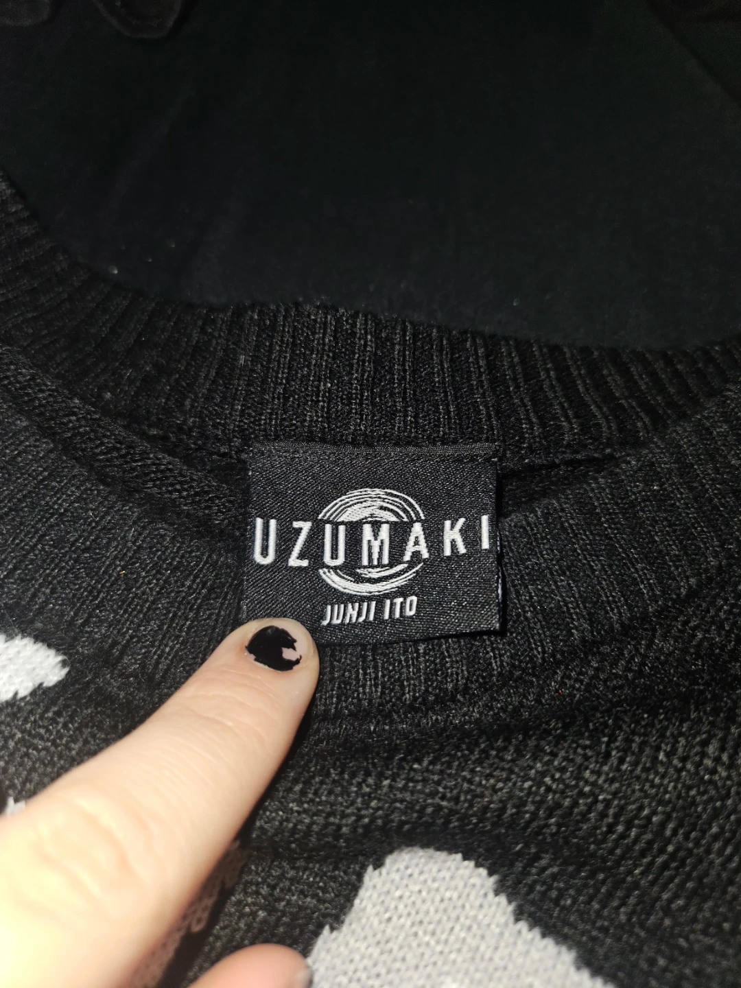 This Uzumaki sweater features a bold graphic from Junji Ito's work. It's made of a knit material. A great piece for fans of horror manga!
